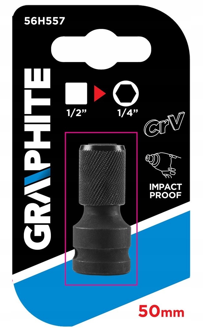 Перехідник 1/2" квадратний до 1/4" HEX 56H557 від GRAPHITE виготовлений із міцної сталі CrV. Він має довжину 50 мм і дозволяє змінювати кріплення з 1" квадрата на 1" шестигранник. Адаптер призначений для ударних гайкових ключів і викруток. Характеризується практичним отвором, що полегшує установку. У свою чергу, рифлена неслизька поверхня кільця дозволяє ефективно та легко замінювати насадки. Адаптер марки GRAPHITE рекомендовано для професіоналів і любителів DIY.