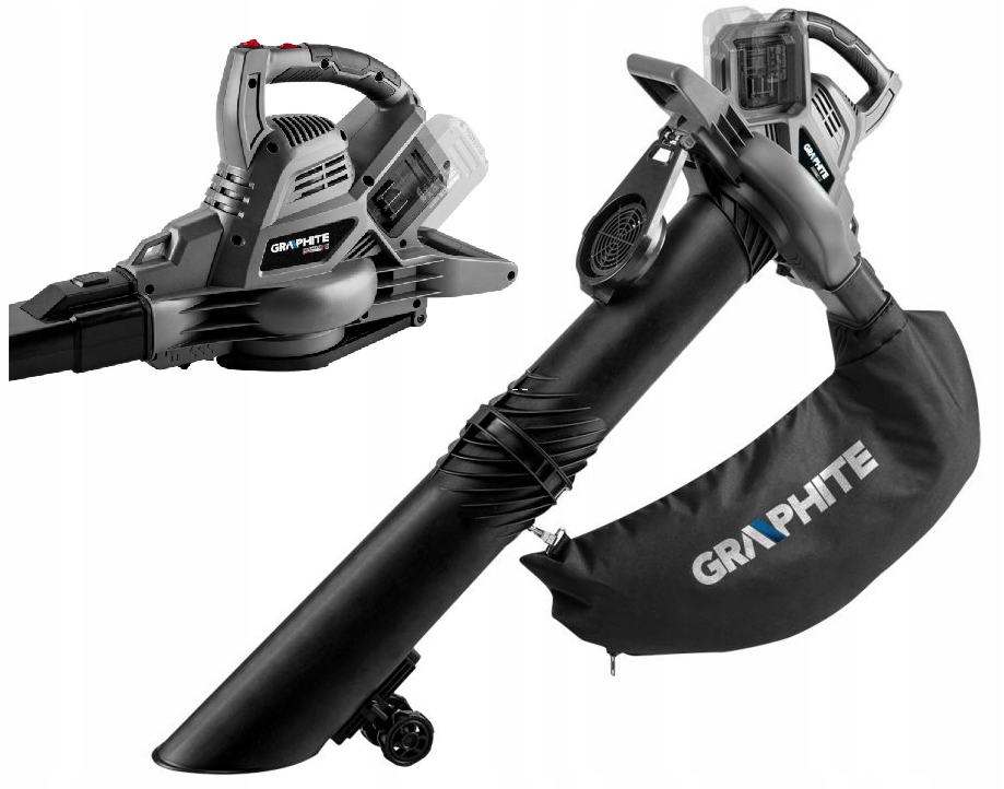 ГРАФІТОВИЙ повітродувник/пилосос для листя, сумісний з літій-іонними акумуляторами 18 В GRAPHITE Energy+ – це практичний і функціональний пристрій для прибирання і позбутися від зайвого листя. Пристрій має дві функції: повітродувка зі швидкістю повітряного потоку 200 км/год і пилосос, який одночасно подрібнює зібране сміття. Виріб укомплектований тканинним мішком об'ємом 35 л Прилад оснащений плечовим ременем, що робить роботу більш комфортною.