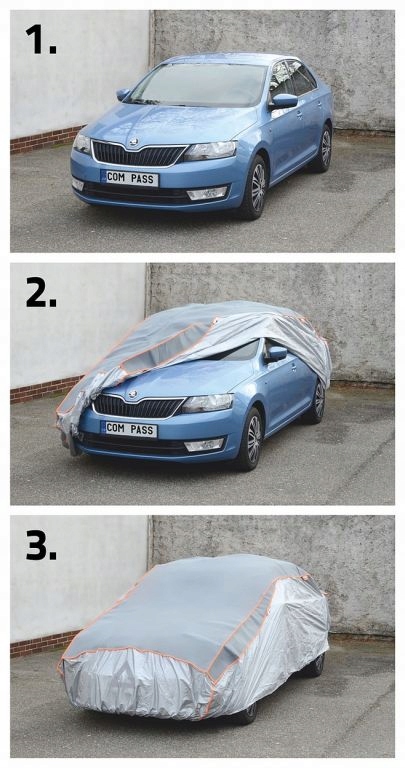 Верхня частина посилюється армованим матеріалом, який може поглинати гради град під час граду і, таким чином, запобігти пошкодженню транспортного засобу. Легке кріплення брезенту - його кладуть лише для автомобіля, деякі з гумовими пришитами кріпиться з дна відповідними вкладками тіла/бампера, а передня і задня частина брезенту точно кріпиться з пришитними смугами від пряжки. Поглинання за допомогою граду ударного брезенту є високоефективним для розміру близько 12 мм зі швидкістю удару до 74 км/год. Якщо ці значення перевищені, захисний ефект не гарантується.
