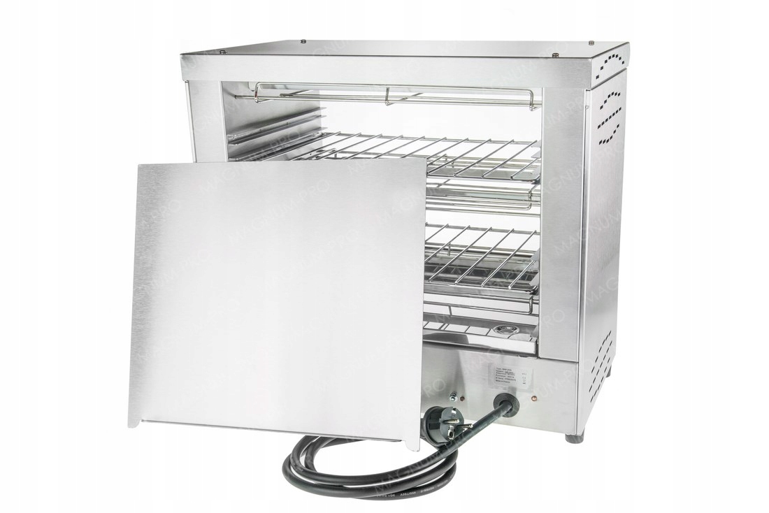 Корпус пристрою виготовлено з високоякісної нержавіючої сталі, що робить його стійким до корозії та механічне пошкодження. Тостер має 2 решітки розміром 350 х 240 мм зі знімними ручками. Знімна задня панель і знімний піддон для крихт спрощують очищення пристрою, ним можна керувати з обох боків як прохідною саламандрою для запіканок.
