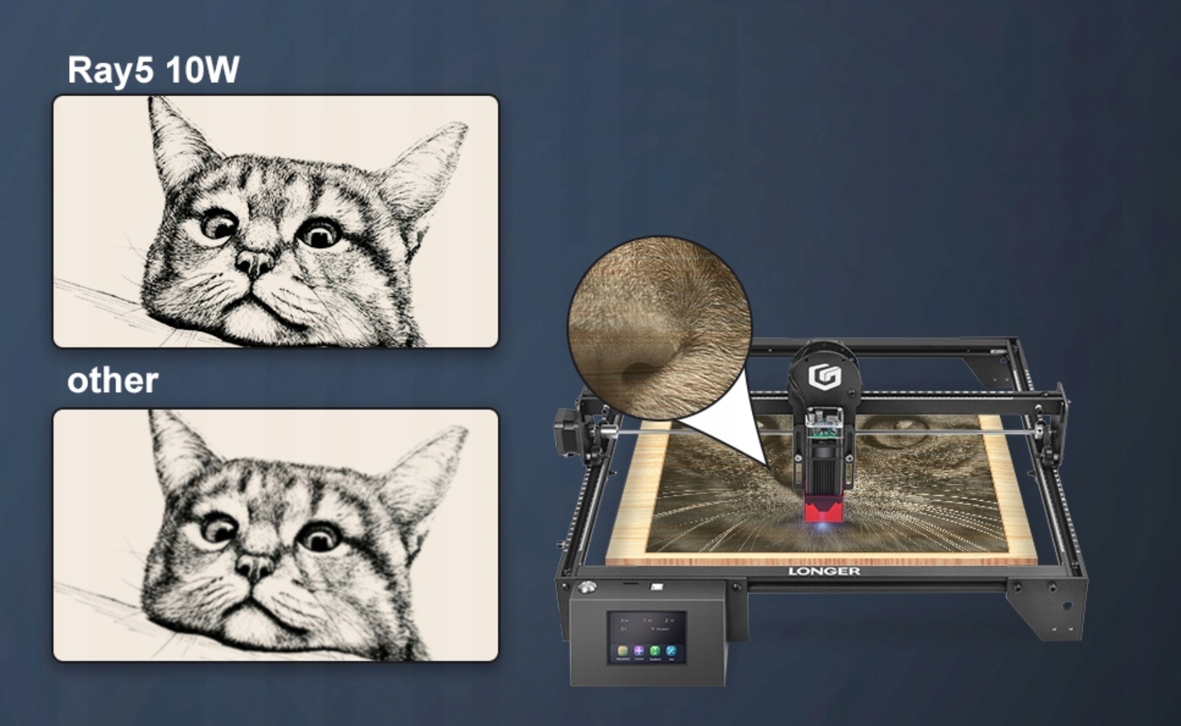 Ray5 10w із 3,5-дюймовим сенсорним екраном додає нові функції, такі як кілька способів передачі даних і керування декількома машинами. Порівняно з іншими лазерними гравірувальними машинами, він може гравірувати до 1000+ матеріали.