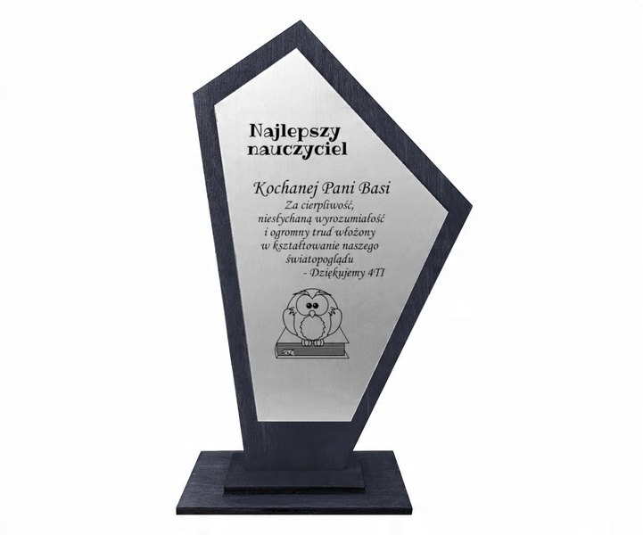 Статуя з дерева (фанера 3мм) кольору "графіт". На статуетку приклеюється пластина з будь-яким ГРАВІЮВАННЯМ. Таблички з гравірувального ламінату, два кольори на вибір: сріблястий та золотистий.