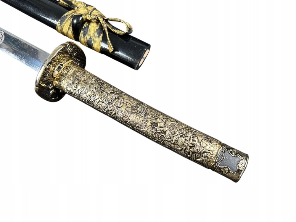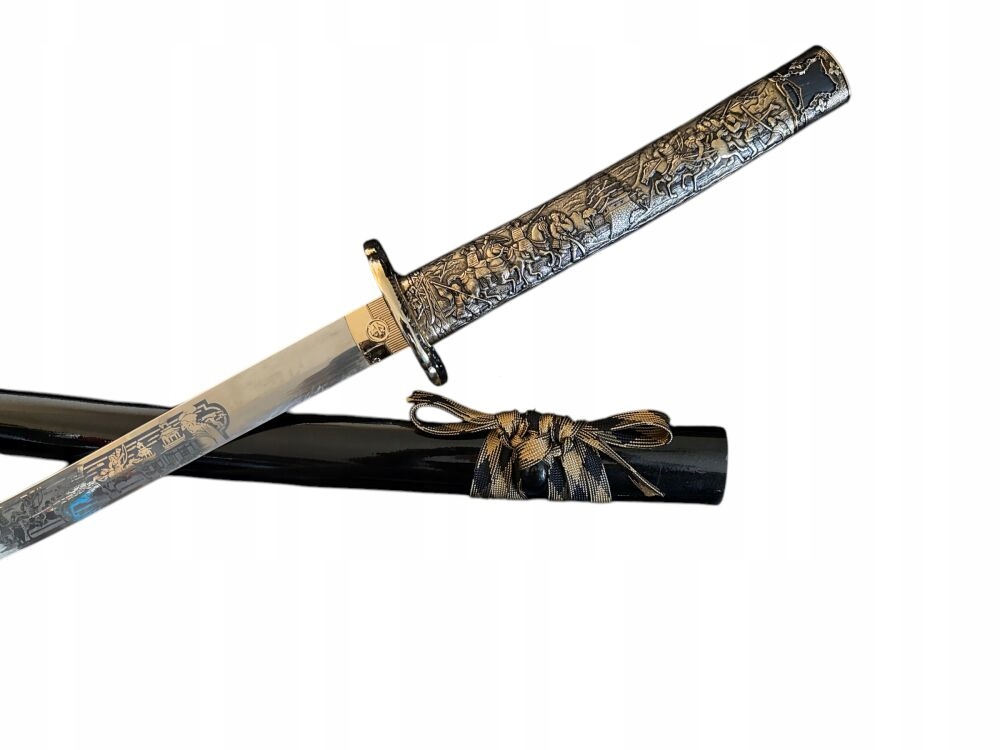 включений з унікальною піхвою (Сая), прив’язаною на шию (Koiguchi) мотузку (sageo), прокрученим Курі-Кат. Сталь із зображенням самурая з обох боків