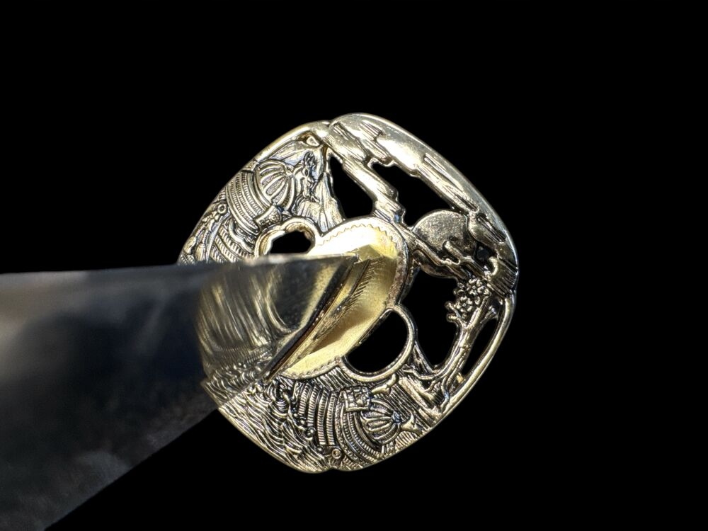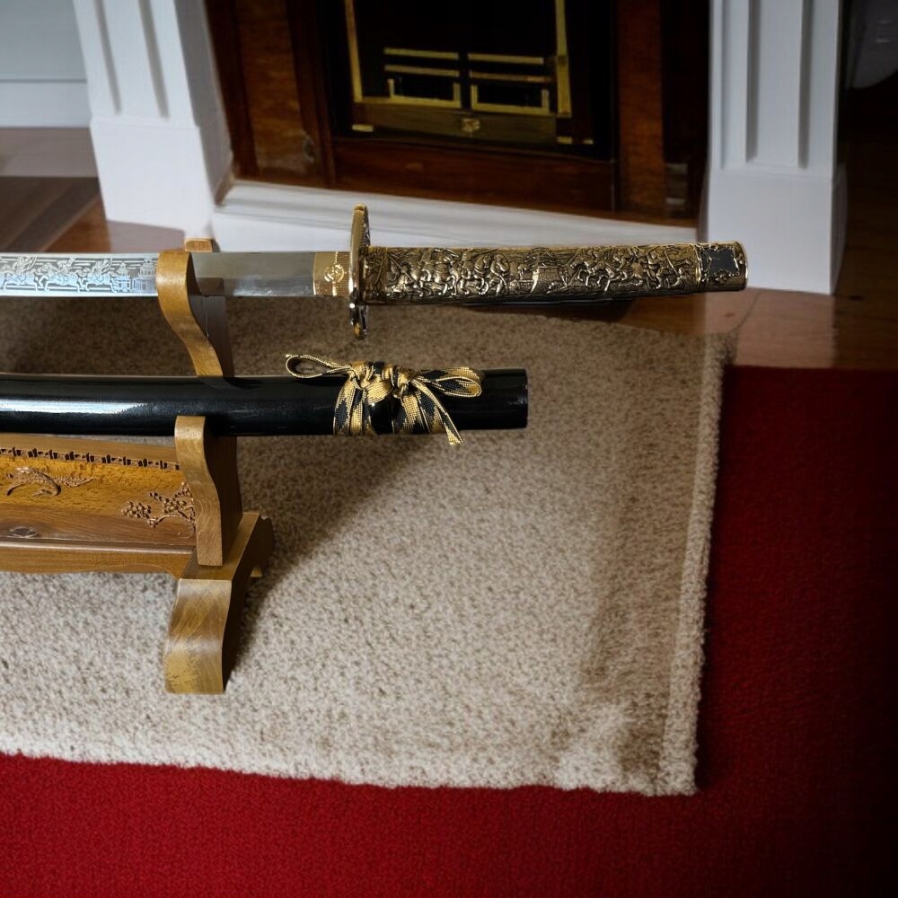 на лезі унікальна подвійна гравірування, що зображує сцени з історії Японії
