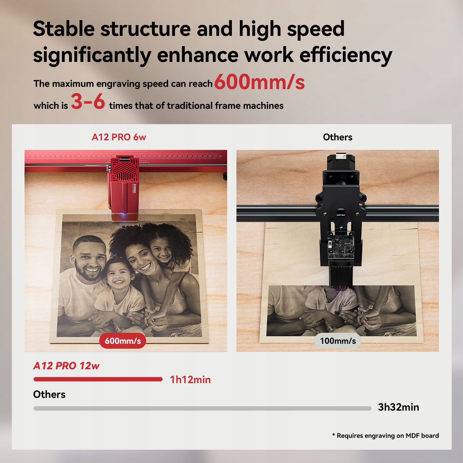 Стабільніша та швидкіша структура:Нижня рама A12 Ultra є цільною, металева вісь X має подвійну -осьова направляюча рейка, робоче хвилювання дуже мало, щоб гарантувати, що машина не тріпотить у високошвидкісному режимі роботи зі швидкістю 500 мм/с (дані є швидкістю механічного руху рами, машина малої потужності повинна скоригувати швидкість униз, інакше знаки гравіювання будуть дуже плоскими );