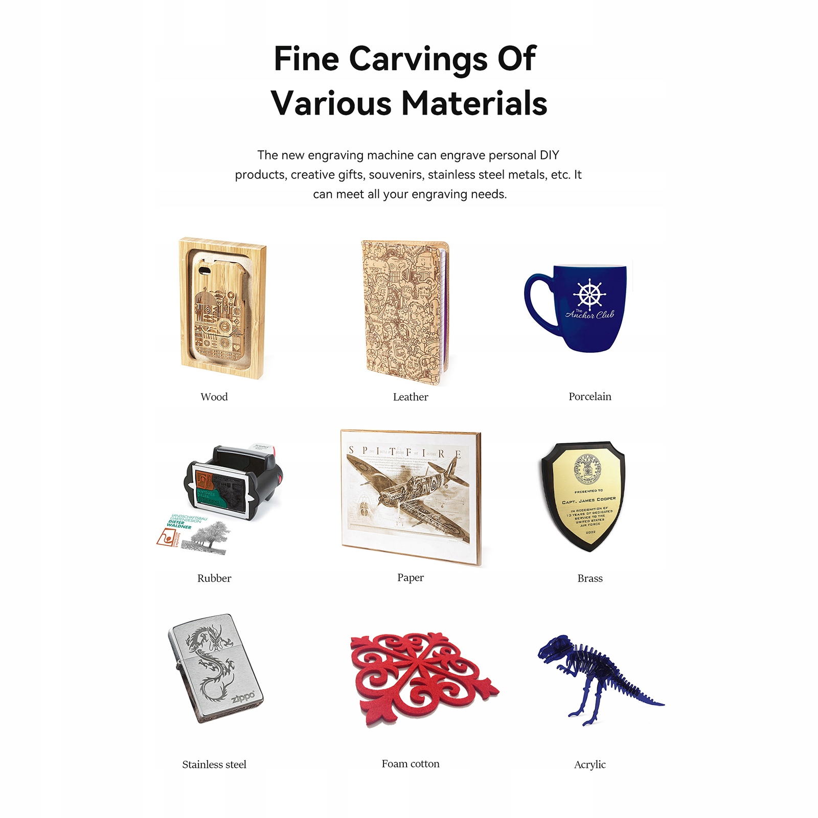Матеріали для різьблення: дерево, бамбук, картон, пластик, шкіра, друкована плата, оксид алюмінію, антиблікове покриття та фарба для металу, нержавіюча сталь 304 дзеркало, скло, кераміка, бавовняна тканина, шифер;