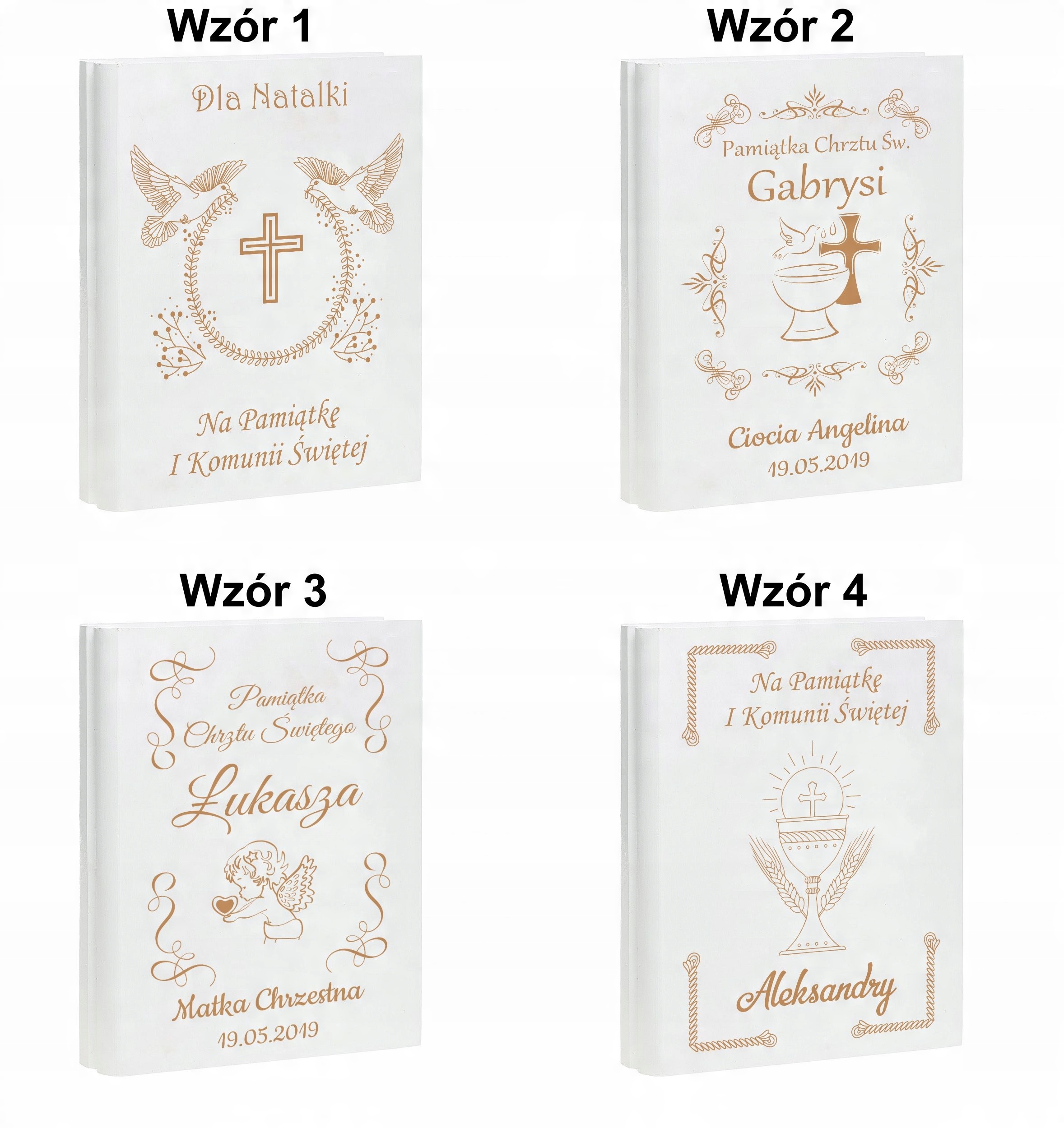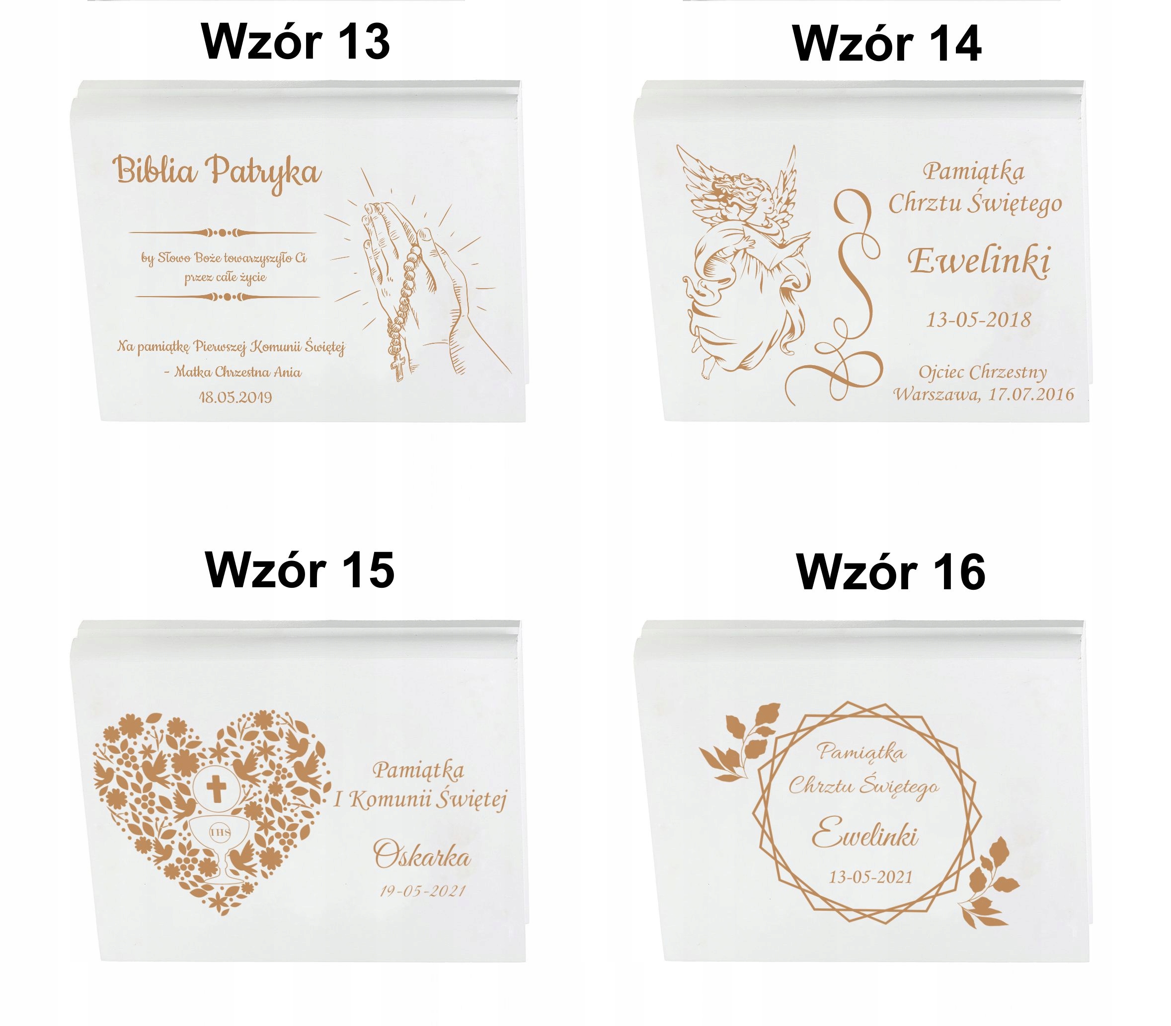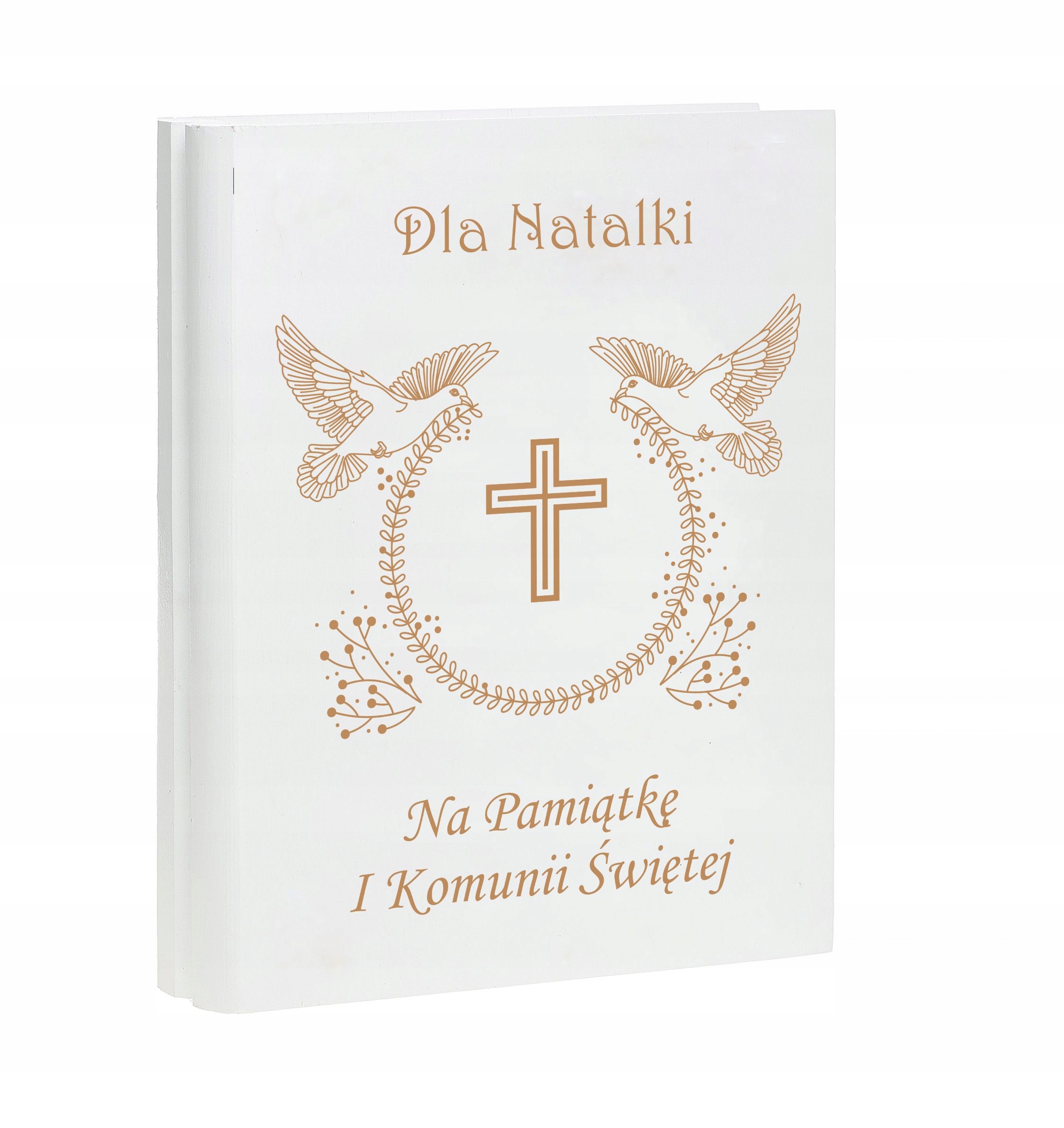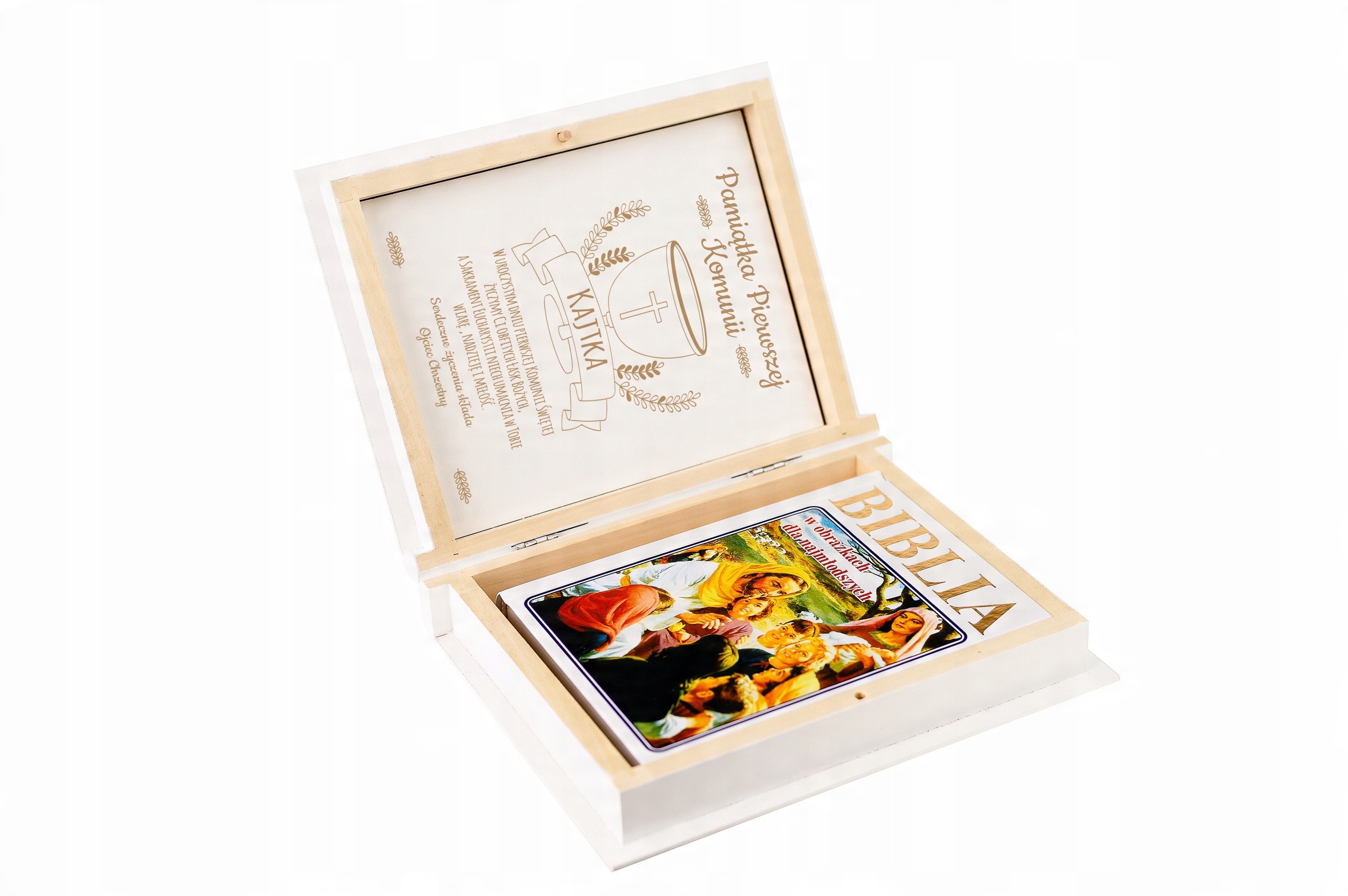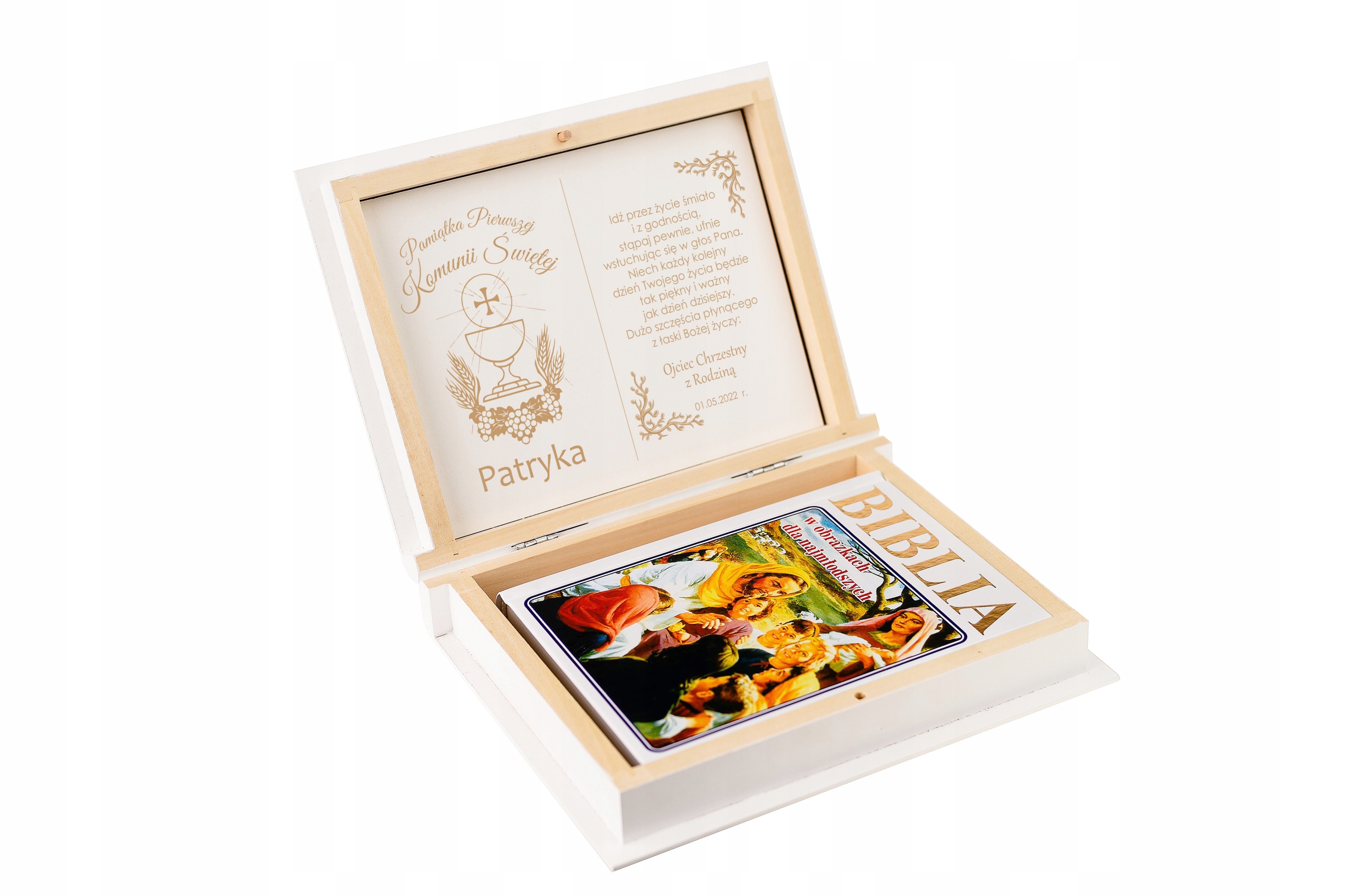 Ілюстрована Біблія для дітей у дерев’яній коробці – це цікава ідея подарунка до Першого Святого Причастя чи Святого Хрещення. Ми можемо вигравірувати індивідуальну присвяту на кришці коробки на основі дизайну, доступного нижче. Всередині коробки на кришці є декоративна біла пластина, вирізана за розміром, яку також можна персоналізувати. Завдяки використаному рішенню інтер’єр коробки виглядає стильно та елегантно.