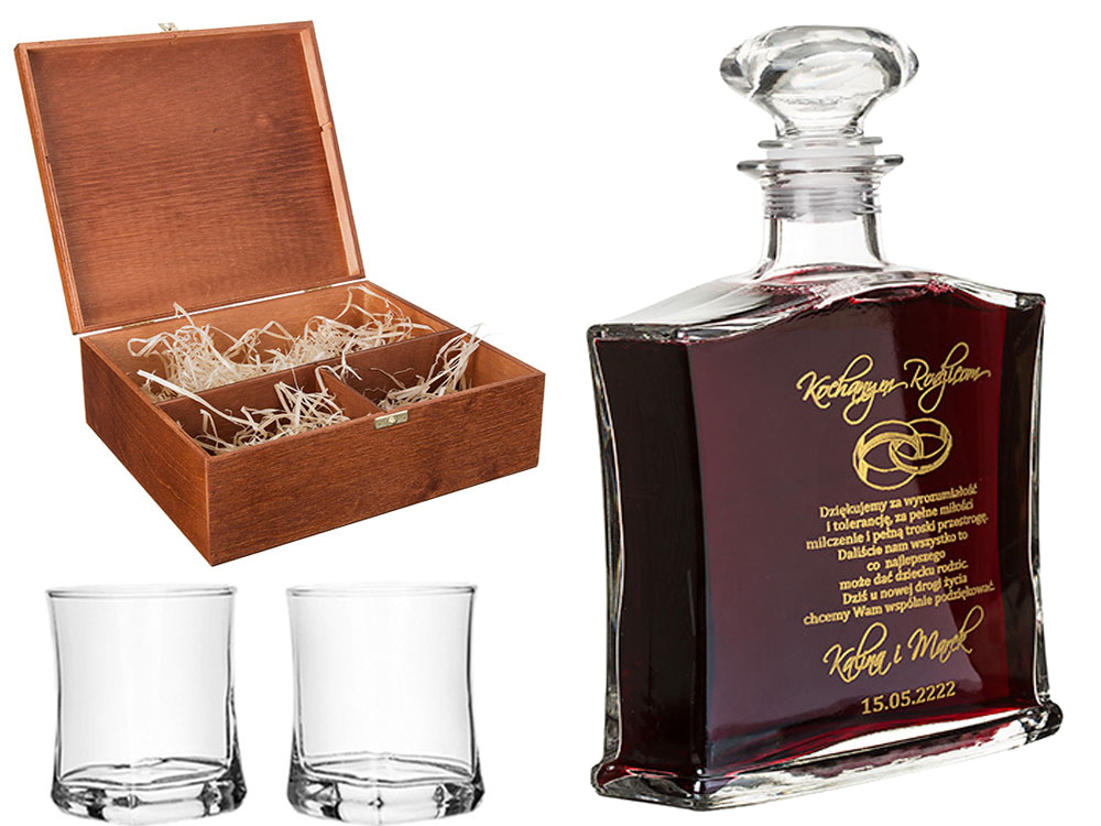 Не можете вирішити, який подарунок вибрати як подяку батькам? Збираєтеся на сімейне свято і не знаєте, що купити імениннику? Купіть цей графин! Це красивий виріб, сформований вручну, що робить кожен унікальним. Крім того, вона гравірується на високоякісному лазерному плотері, а гравірування наноситься майстром вручну дуже ретельно спеціальною фарбою. Позолочене/срібне покриття переливається на світлі, що дає дивовижний ефект. Крім того, в набір входить дві склянки і коробка з дуже дорогої березової фанери 8мм в кольорі суміш палісандра і червоного дерева. Зовні вся коробка покрита лаком, що надає їй легкого блиску. Він також має стару золотисту застібку та петлі. Як безкоштовний подарунок ми додаємо дуже якісне наповнення з необроблених дерев’яних смуг. Одержувач, безсумнівно, буде радий, коли бачать такий гарно зроблений подарунок :) p>