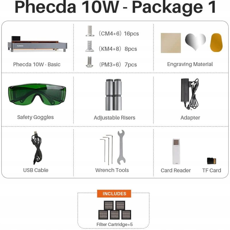 Цей інноваційний дизайн не тільки захищає очі від шкідливого УФ -випромінювання , але також служить прозорим покриттям, який фільтрує лазер і дозволяє бачити сліди світлого місця гравірування . Крім того, він виконує функцію збору пристрою Дим , тим самим збільшуючи ефективність фільтра диму. Про Забезпечте максимальну безпеку, пристрій оснащений окулярами Захисне, що захищають очі. Безпека є найважливішою в Elegoo Phecda завдяки інтегрованому датчику , який негайно зупиняє дію і випромінює звукове попередження у випадку виявлення полум'я. У разі випадкового руху, нахилу або перекидання Пристрої під час роботи він негайно припинить працювати і почати Система тривоги .