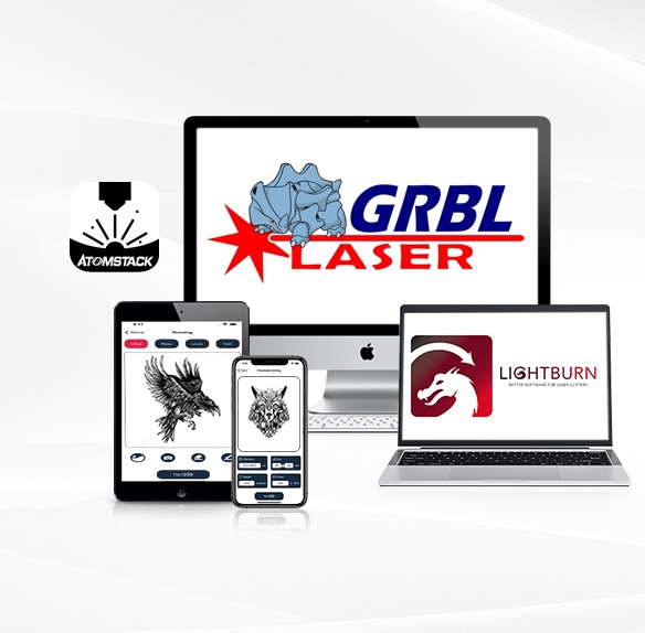 Ця машина сумісна з багатьма популярними програмами гравірування, такими як Lasergrbl та Lightburn. Він підтримує системи Windows XP, Windows 7, Windows 8, XP та Windows 10, а також Mac Systems (Lightburn). Підтримувані формати гравірування - NC, BMP, JPG, PNG та DXF.