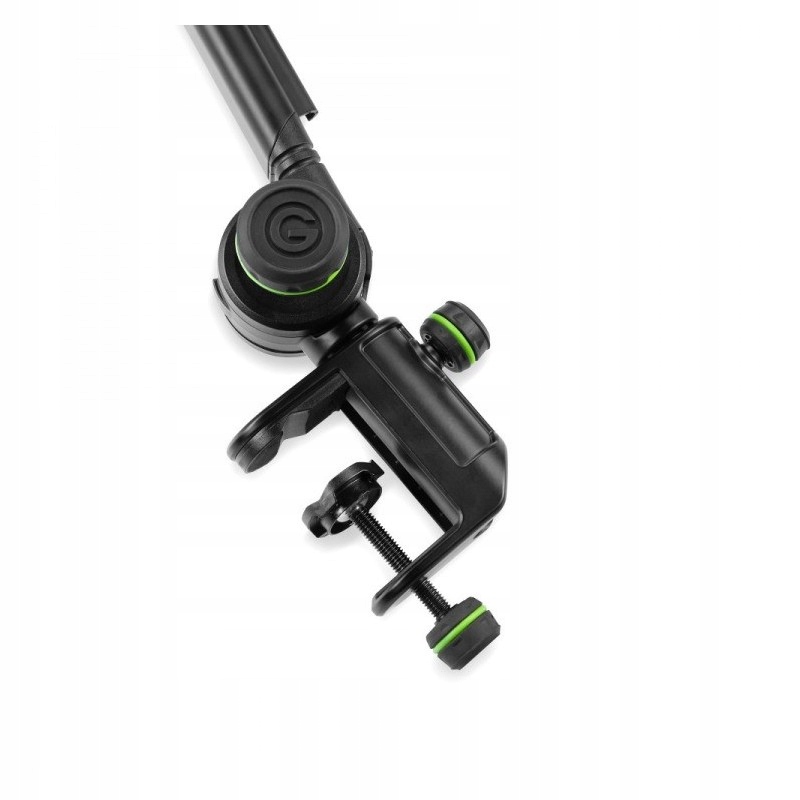Три шарніри дозволяють регулювати цю стрілу, встановлену на столі, майже в будь-якому положенні. Ще одна спеціальна функція, яку бренд Gravity® розробив для механізму тримача мікрофона, дозволяє знімати весь тримач мікрофона однією рукою та повертати його на 90°, навіть якщо мікрофон пригвинчено на місці або на амортизаторі. Ця ручка автоматично повертається на місце. Чому він такий особливий?