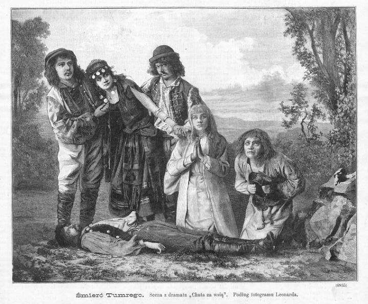 Сцена з вистави п’єси Яна Канті Ґаласевича та Зофії Меллер за Юзефом Іґнациєм Крашевським у театрі «Бель Вю» у серпні 1884 р.; побачити Симон 1971 т. 1 С. 251. У ролі Ази - Вільгельміна Бауман (Бауманн), Тумрего - Кароль Копчевський, Мотруна - Маєровичова, Янка - Юзеф Пославський.