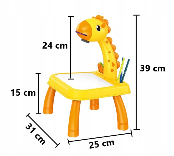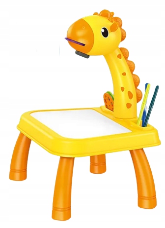 жирафіновий проектор зі столом -це чудовий пристрій, призначений для всіх дітей віком від 3 років, обидва для тих, хто має варення, і тих, хто хоче розпочати свою пригоду з малюнком. Естетично зроблений проектор дозволяє поєднувати розваги з розвитком уяви та творчості та покращує ручні здібності дитини. 4 Мелодії , насолоджуючись живописом суглобів.