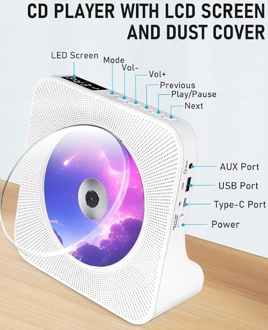 Працює з усіма вашими улюбленими пристроями Bluetooth: iPhone, планшетами, колонками, навушниками та іншими пристроями Bluetooth. Широка сумісність із аудіофайлами CD/CD-R/CD-RW/MP3/WMA. Hifi CD-програвач також можна підключити до дротових навушників і динаміка за допомогою кабелю AUX. Ідеальний подарунок для родини, друзів або колег.