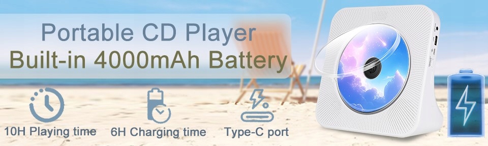 Можна заряджатися за допомогою кабелю Type-C, що входить у комплект, до десяти годин одноразового використання. Зовнішній програвач компакт-дисків із акумулятором є ідеальним вибором для візьміть із собою на вечірку чи в подорож!