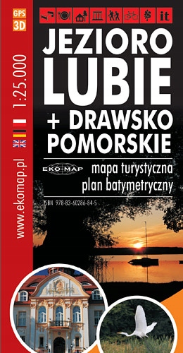 Туристична карта з батиметричним планом озера Люб'є - другої за величиною водойми в районі Дравського озера. Детальна інформація для рибалок, моряків і дайверів: розташування підводних пагорбів, скупчень рослинності і перешкод, а також пристаней, пристаней і рибальських станцій. На карті представлені всі туристично-рекреаційні бази, розташовані на озері. Рельєф місцевості представлений за допомогою контурів та 3D штрихування, а також представлена тривимірна візуалізація рельєфу дна озера. На зворотному боці карти розміщено оновлений план Дравско-Поморського воєводства з коротким туристичним путівником та переліком закладів розміщення.