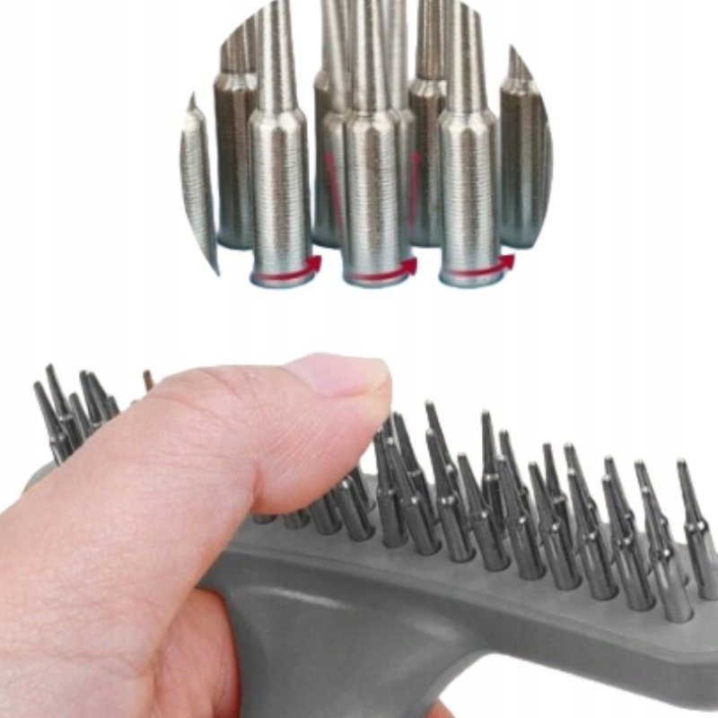 Зубці конічної форми забезпечують охоплення та розчісування аж до шкіри тварини, навіть із густою та сплутаною шерстю.
