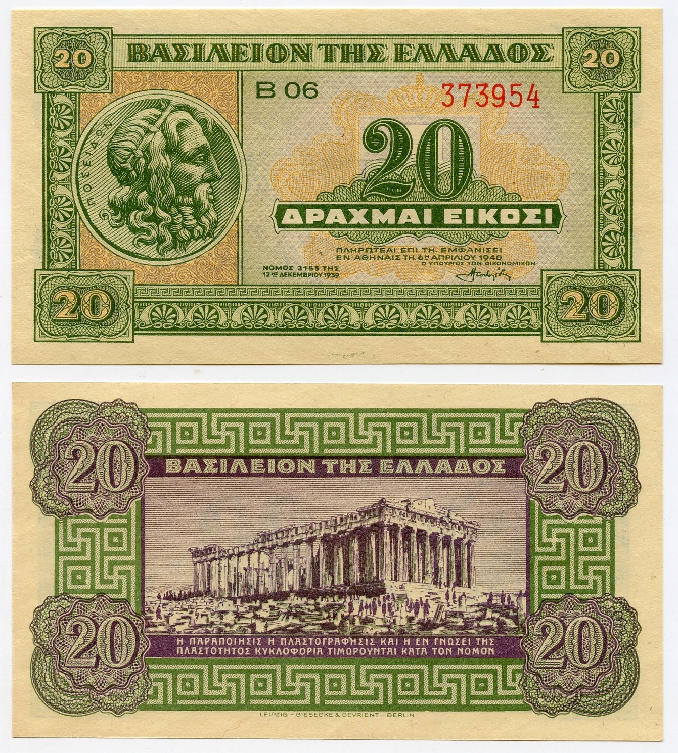 ГРЕЦІЯ 20 ДРАХМ 1940 04.06 Р-315 UNC