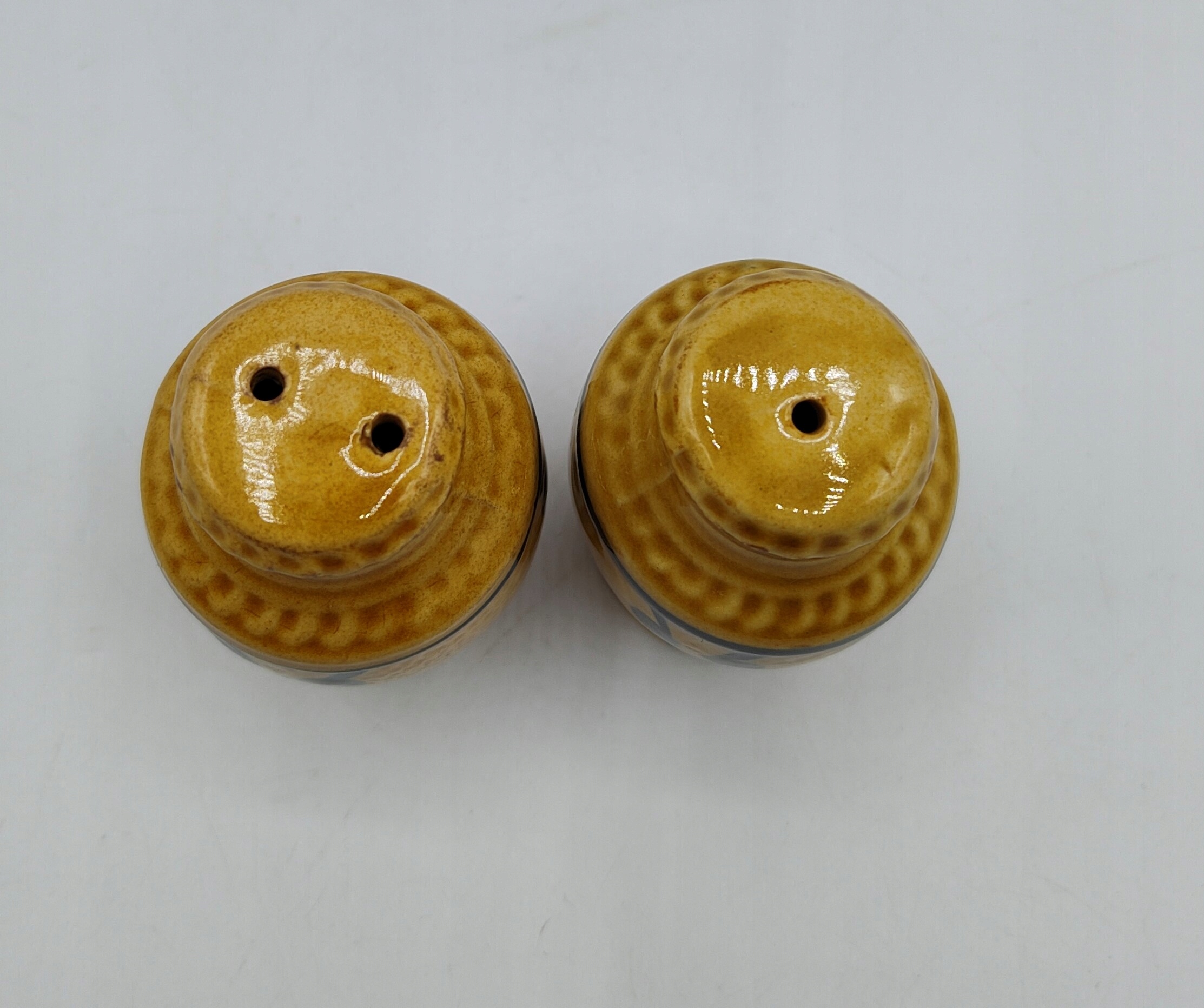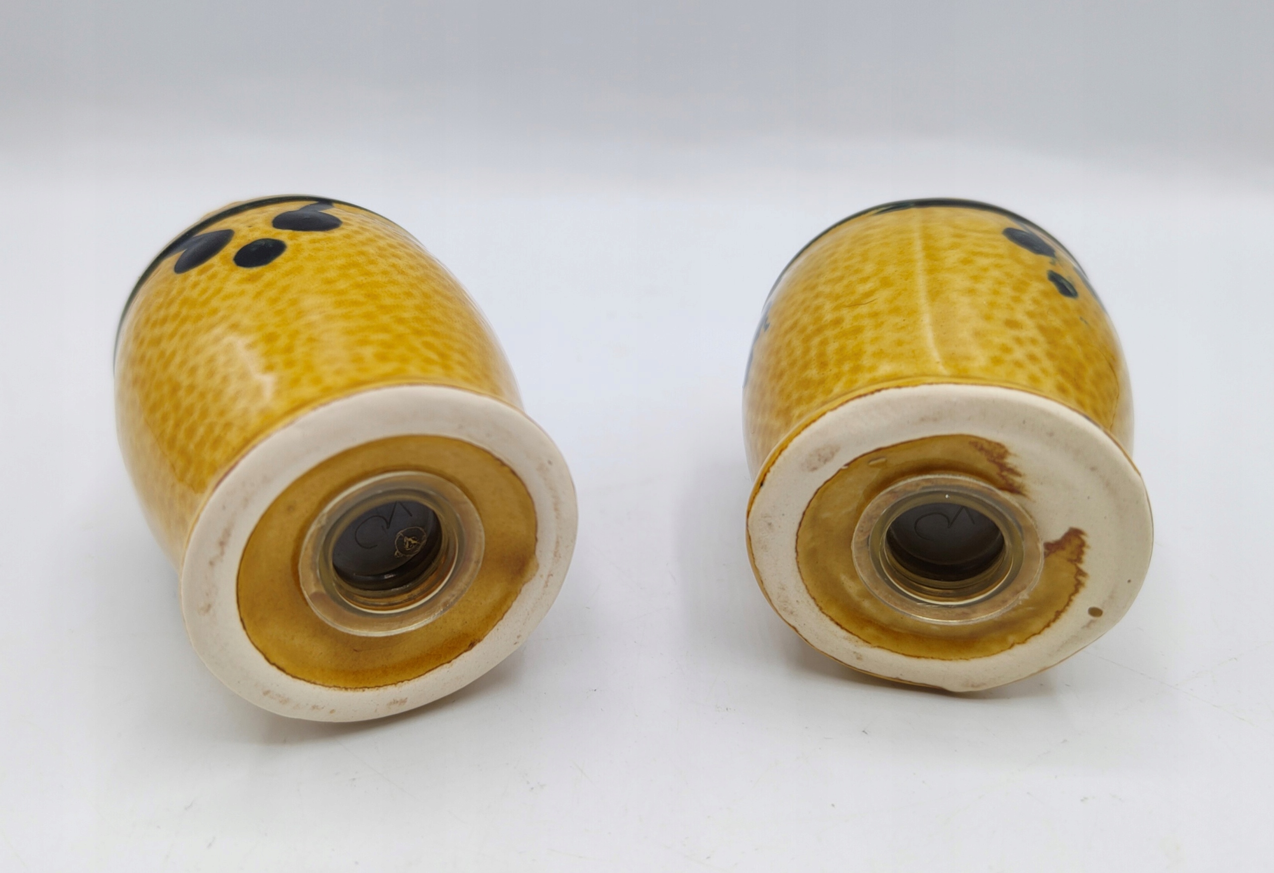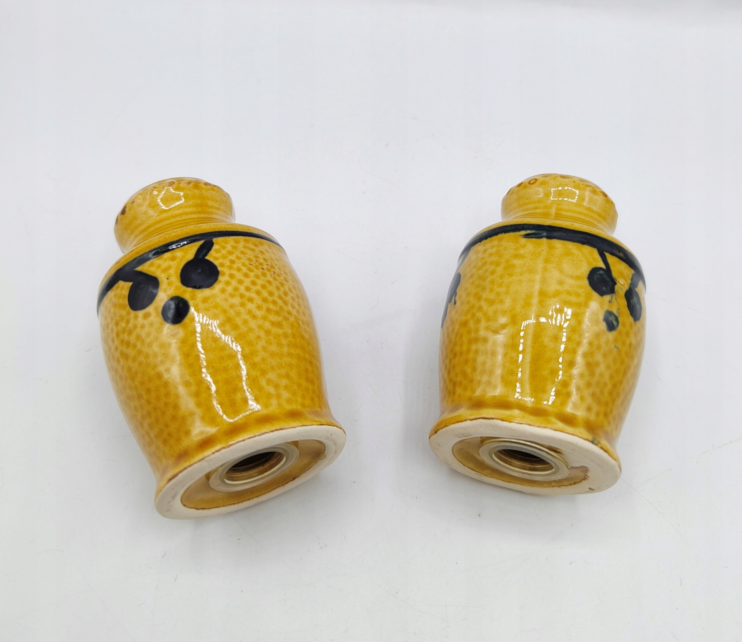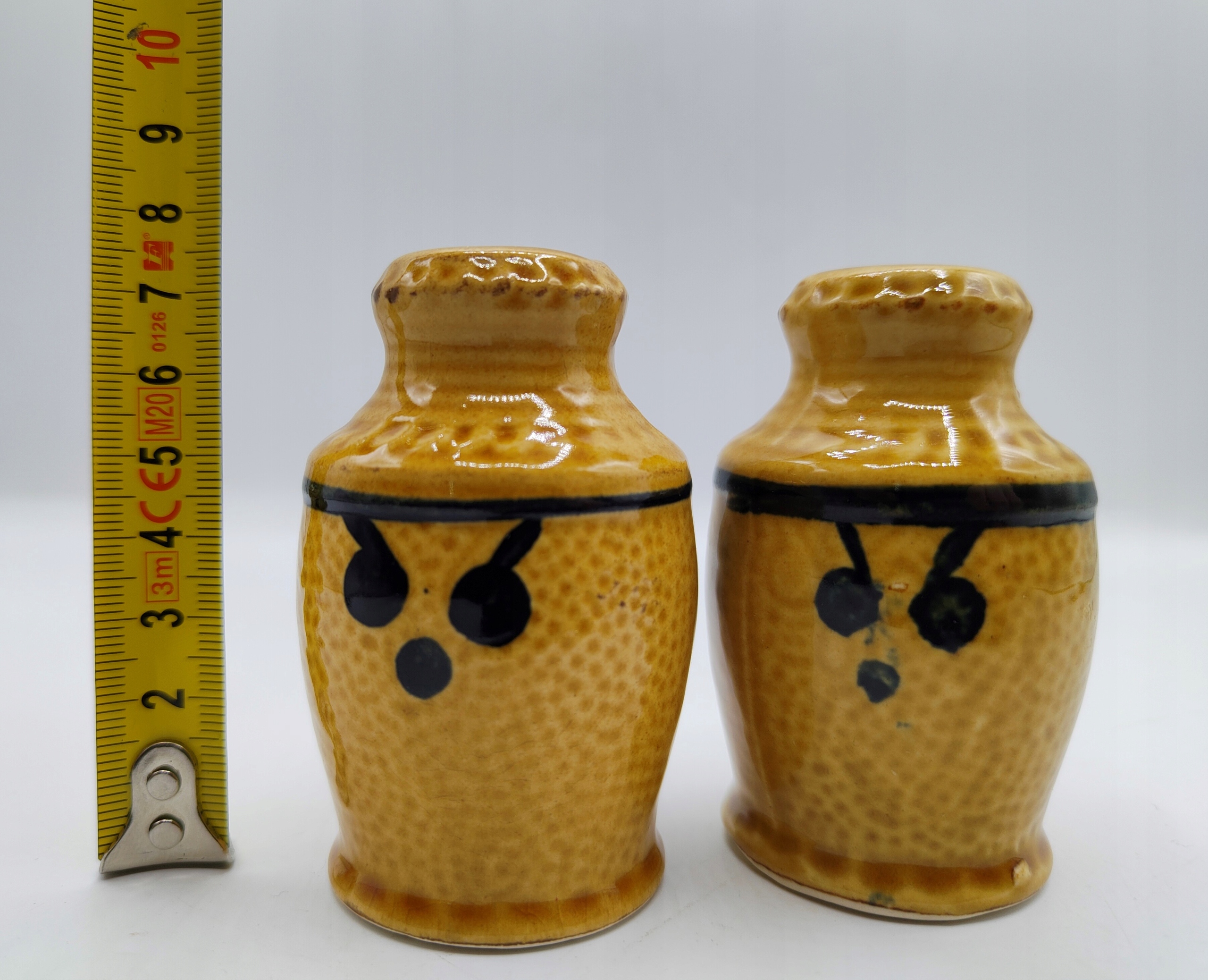 Кераміка, з пробками внизу . Висота сільнички 7,5 см, вага набору 140 грам. Не мають пошкоджень та вм'ятин. У житті сільнички виглядають так само гарно, як і на фото. Колекційний і утилітарний. Рекомендую.