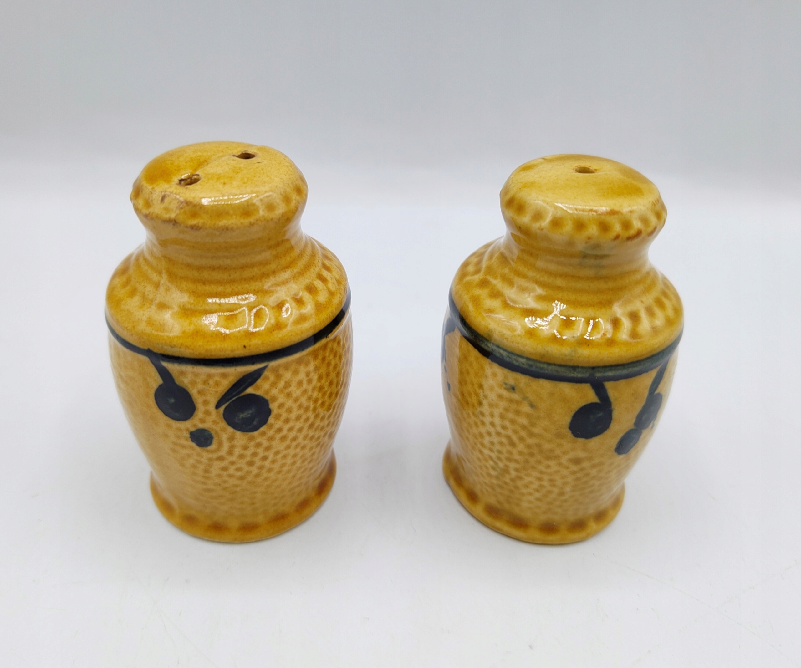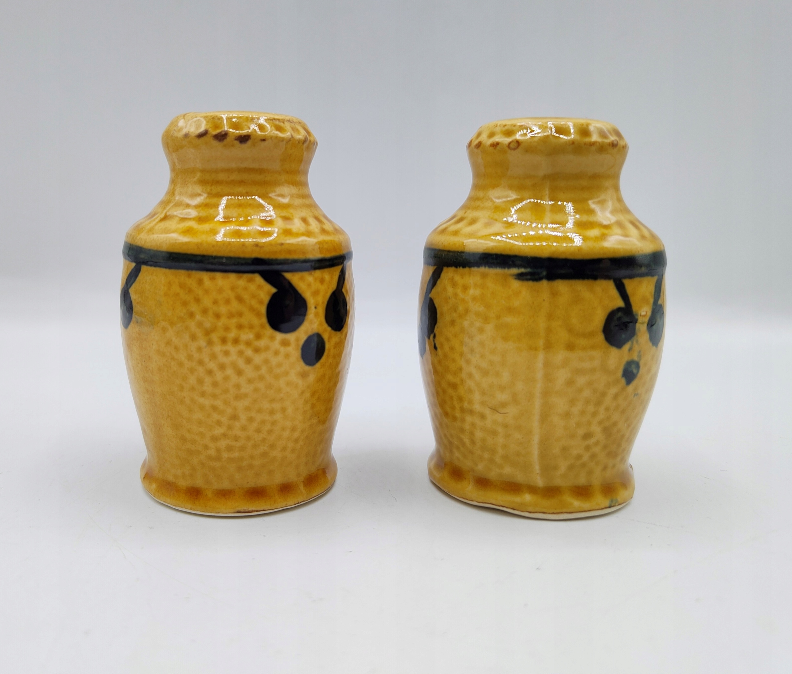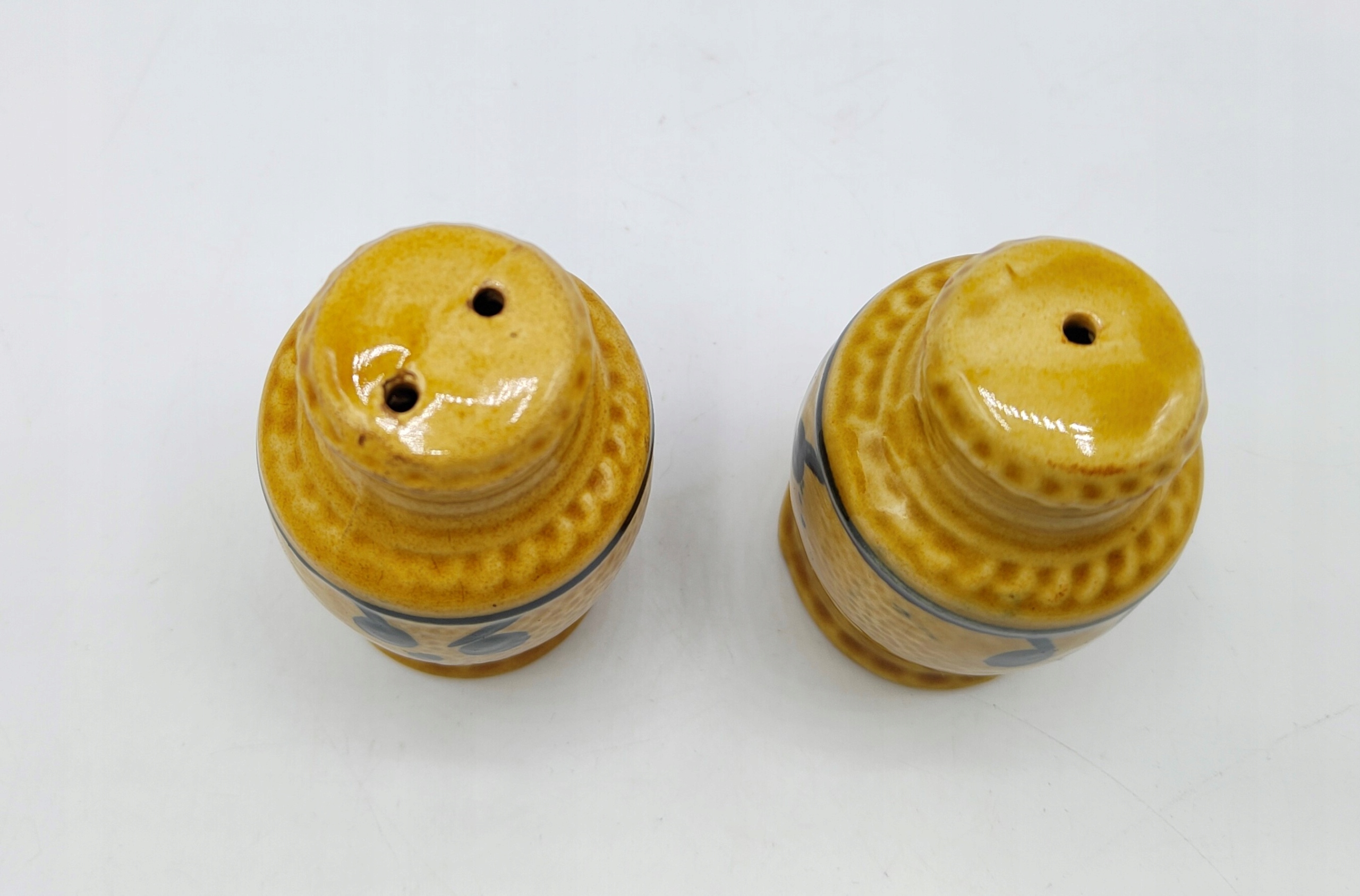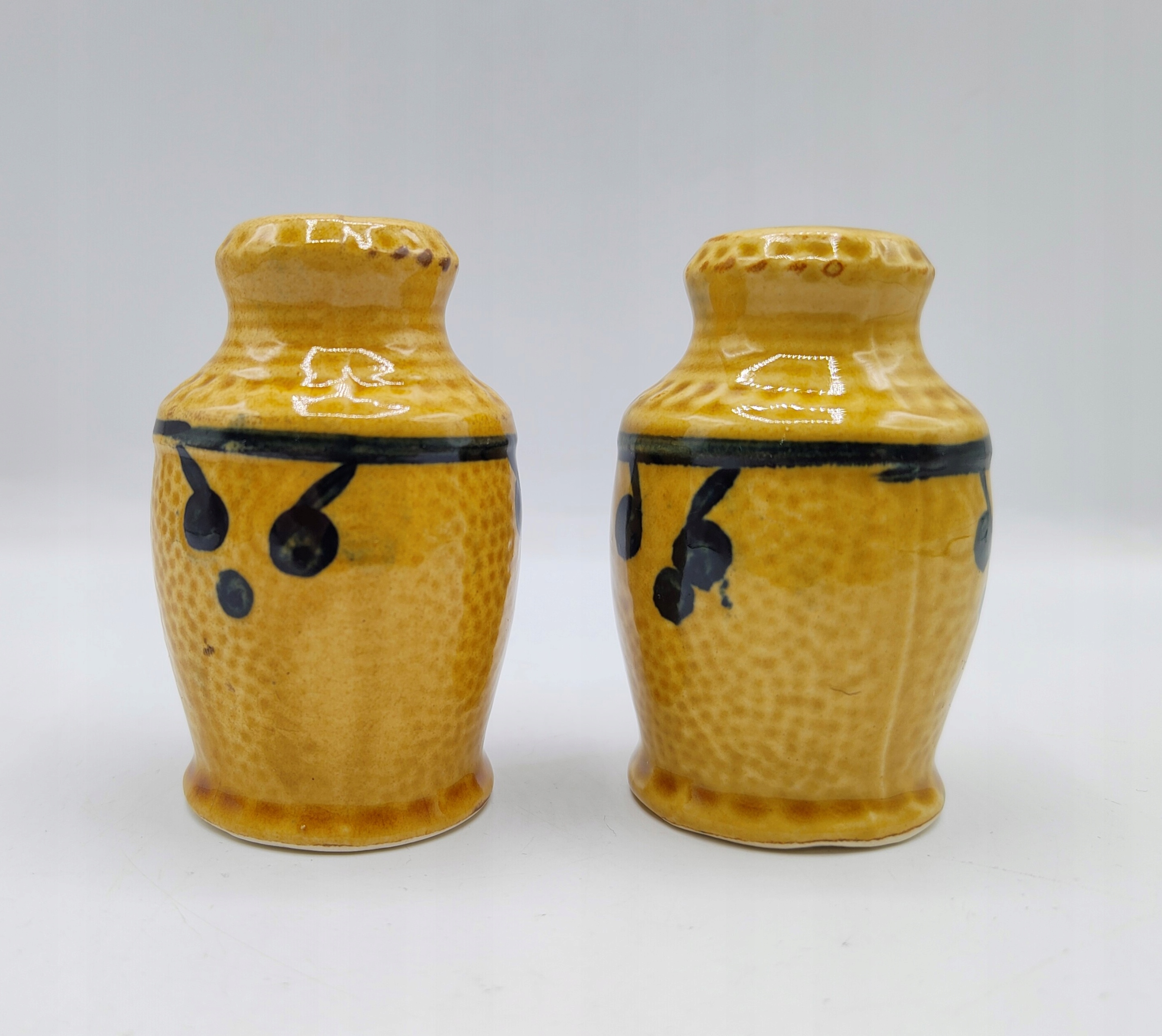 Кераміка, з пробками внизу . Висота сільнички 7,5 см, вага набору 140 грам. Не мають пошкоджень та вм'ятин. У житті сільнички виглядають так само гарно, як і на фото. Колекційний і утилітарний. Рекомендую.