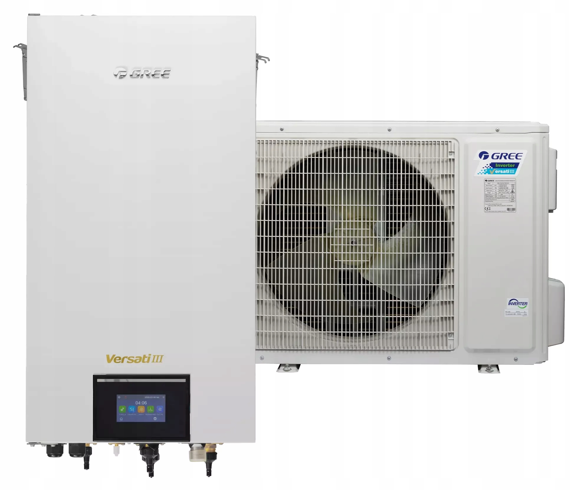 Теплові насоси Gree Versati III характеризуються надзвичайною ефективністю та енергозбереженням завдяки використанню інноваційних рішень, зокрема інверторної технології. Двоступеневий ротаційний компресор забезпечує надійну роботу навіть в екстремальних умовах, а вбудовані пікові електронагрівачі дозволяють працювати в різних погодних умовах.