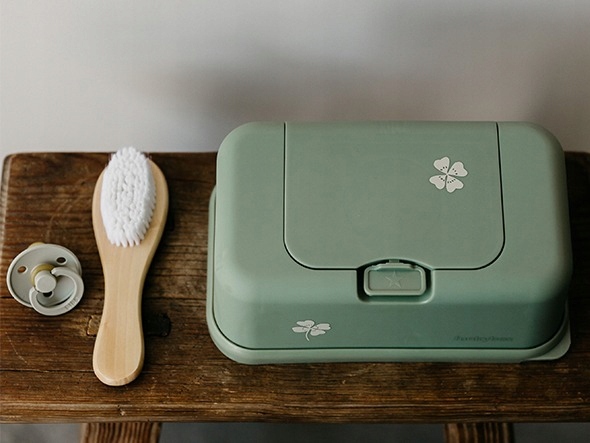 Контейнер у приглушеному зеленому відтінку прикрашений мотивом чотирилистої конюшини.