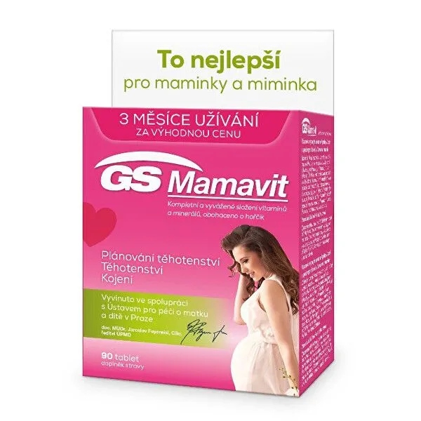 GS Мамавіт - це унікальне додаткове джерело вітамінів і мінералів, правильне надходження яких дуже важливо, особливо під час вагітності, годування груддю або перед планованою вагітністю. Він був розроблений у співпраці з Інститутом догляду за матір'ю та дитиною в Празі-Поділі відповідно до останніх знань про харчування вагітних і годуючих жінок у Чеській Республіці. Він не містить консервантів, барвників або цукру, тому також підходить для діабетиків.