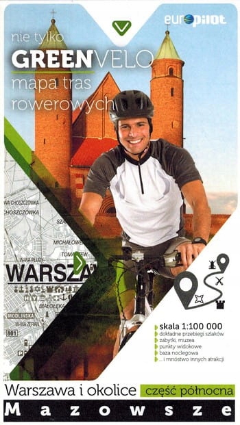 Складна туристична карта велосипедних маршрутів у північній частині Мазовії - Варшава та околиці в масштабі 1:100 000. Легенда польською та англійською мовами.
