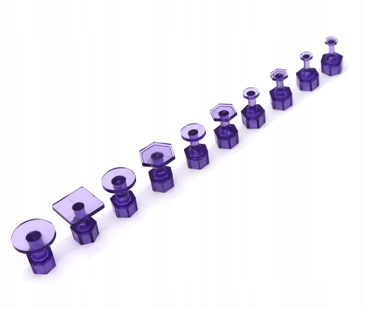 Пропонований набір складається з 10 адаптерів різної форми. Ця кількість дозволяє легко адаптувати відповідний адаптер до форми кузова. Це дає змогу ремонтувати як маленькі, так і великі вм’ятини.