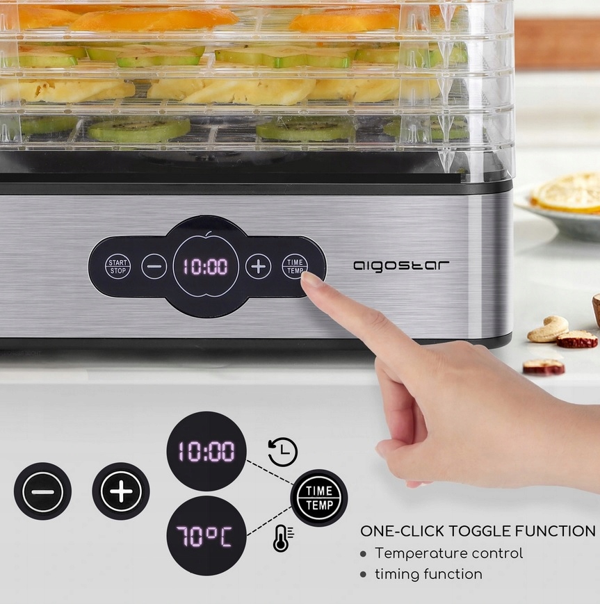 - Точне налаштування температури забезпечує ідеальне сушіння різних видів їжі. Ви можете встановити таймер сушіння від 0 до 99 годин (поділ кожні 30 хвилин). Налаштування температури від 30℃ до 70℃.