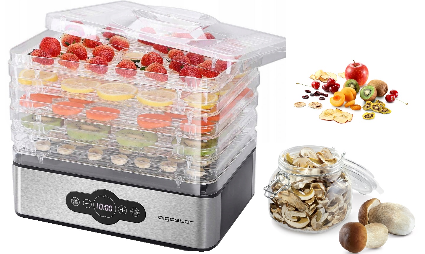 5 лотків (29,7 x 21,6 см) і 1 піддон для збору крапель, нижня горизонтальна система сушильного вентилятора робить наш дегідратор їжі більш ефективним. Захист від перегріву та регульований термостат із автоматичним таймером забезпечують сушіння їжі в оптимальних умовах.