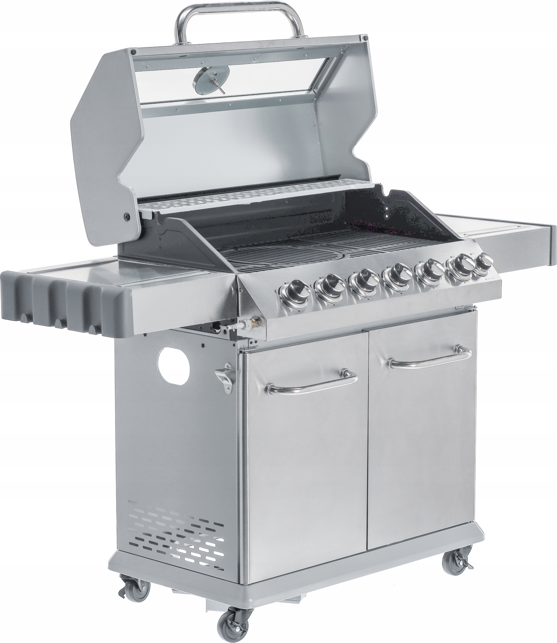 Бічні полиці та містка шафа, що замикається, спрощують зберігання спецій та необхідних аксесуарів. Бічна конфорка потужністю 2,2 кВт дозволить готувати і розігрівати їжу в каструлі або сковороді. Додатковою перевагою є місце для газового балона, ємності з нержавіючої сталі на одній із бічних полиць і вбудованої відкривачки для пляшок.