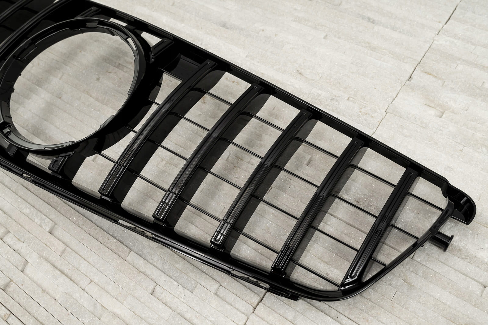 Передня решітка, модель GT / PANAMERICANA для MERCEDES C-CLASS W204 2008-2014. Спеціальна решітка виконана в стилі, типовому для автомобілів сегменту GT. Решітка радіатора прикрашена широкими чорними поперечинами, які неминуче нагадують про респектабельні, потужні автомобілі топ-полиці. Елемент вражає своїм спортивним характером, ідеально поєднуючись із вражаючим дизайном Mercedes.