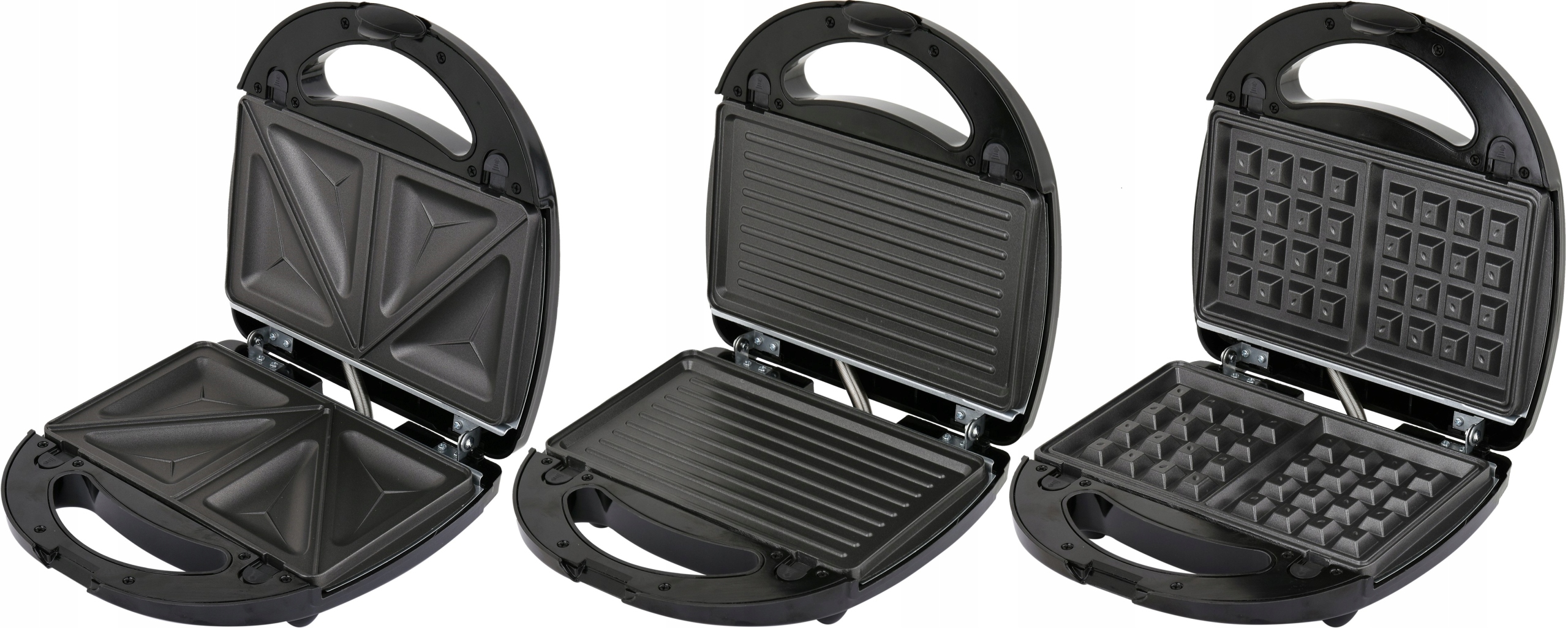 Тостер із трьома змінними пластинами: для тостів, вафель і гриля. Антипригарне покриття забезпечує рівномірне підсмажування та легке знімання їжі з плит.
