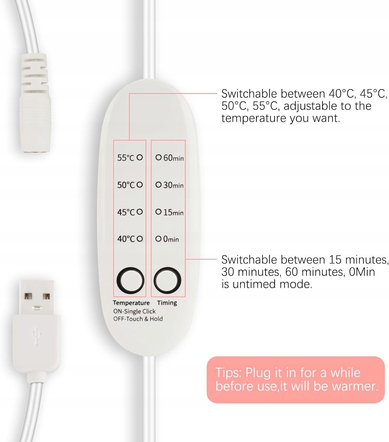 Наша грілка для ніг має 4 налаштування температури та 4 таймера (15 хв, 30 хв, 60 хв і час від часу), які можна встановити на 40°C, 45°C, 50°C і 55°C, можна встановити в залежності від температури. Порада: увімкніть його в розетку на деякий час перед нагріванням.