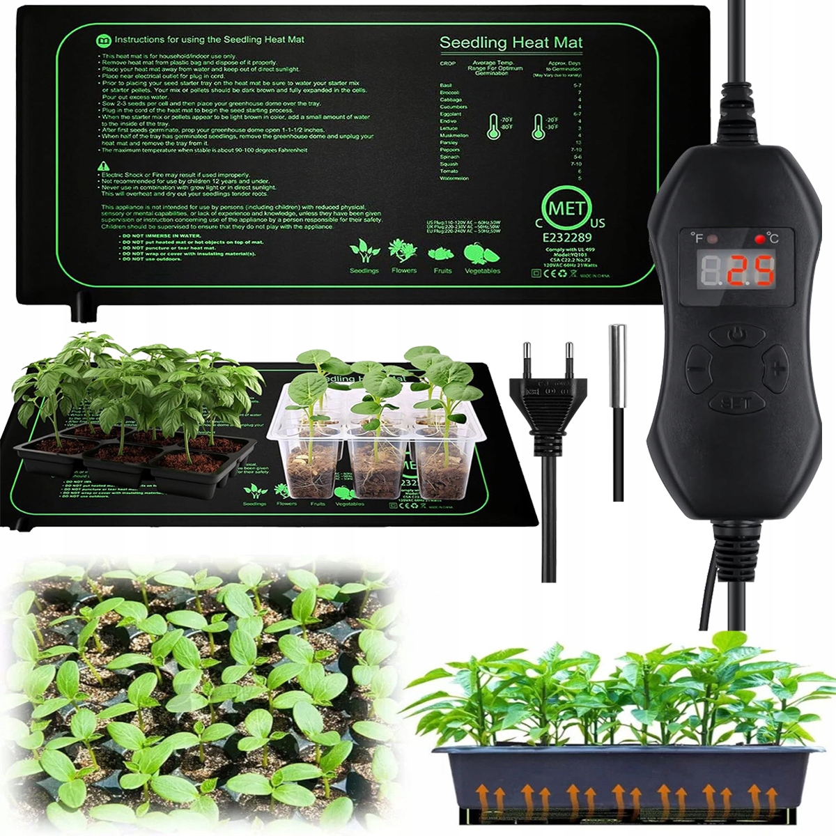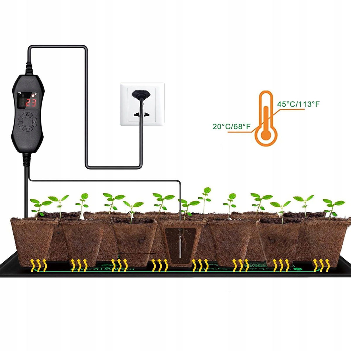 Професійний нагрівальний мат підтримує оптимальну температуру в діапазоні 68-113℉ (20-45℃), що є ідеальною температурою для посадки насіння та розмноження розсади. Нагрівальний килимок нагріває кореневу зону рослин на 10–20°F вище температури навколишнього середовища. Увімкніть живлення, зачекайте приблизно 10-30 хвилин, пристрій почне повільно нагріватися.
