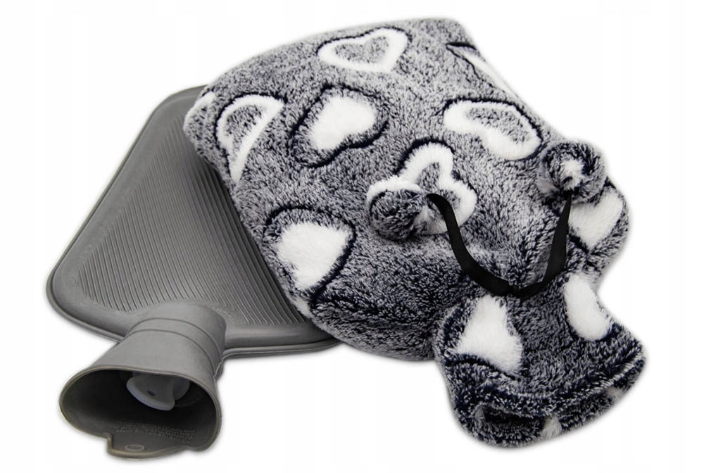 - пляшка з гарячою водою сірого плюшу з сердечками.