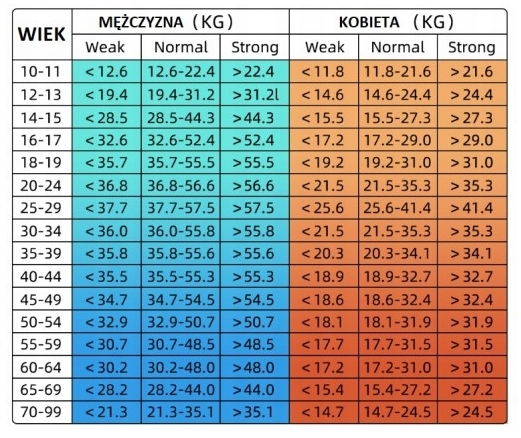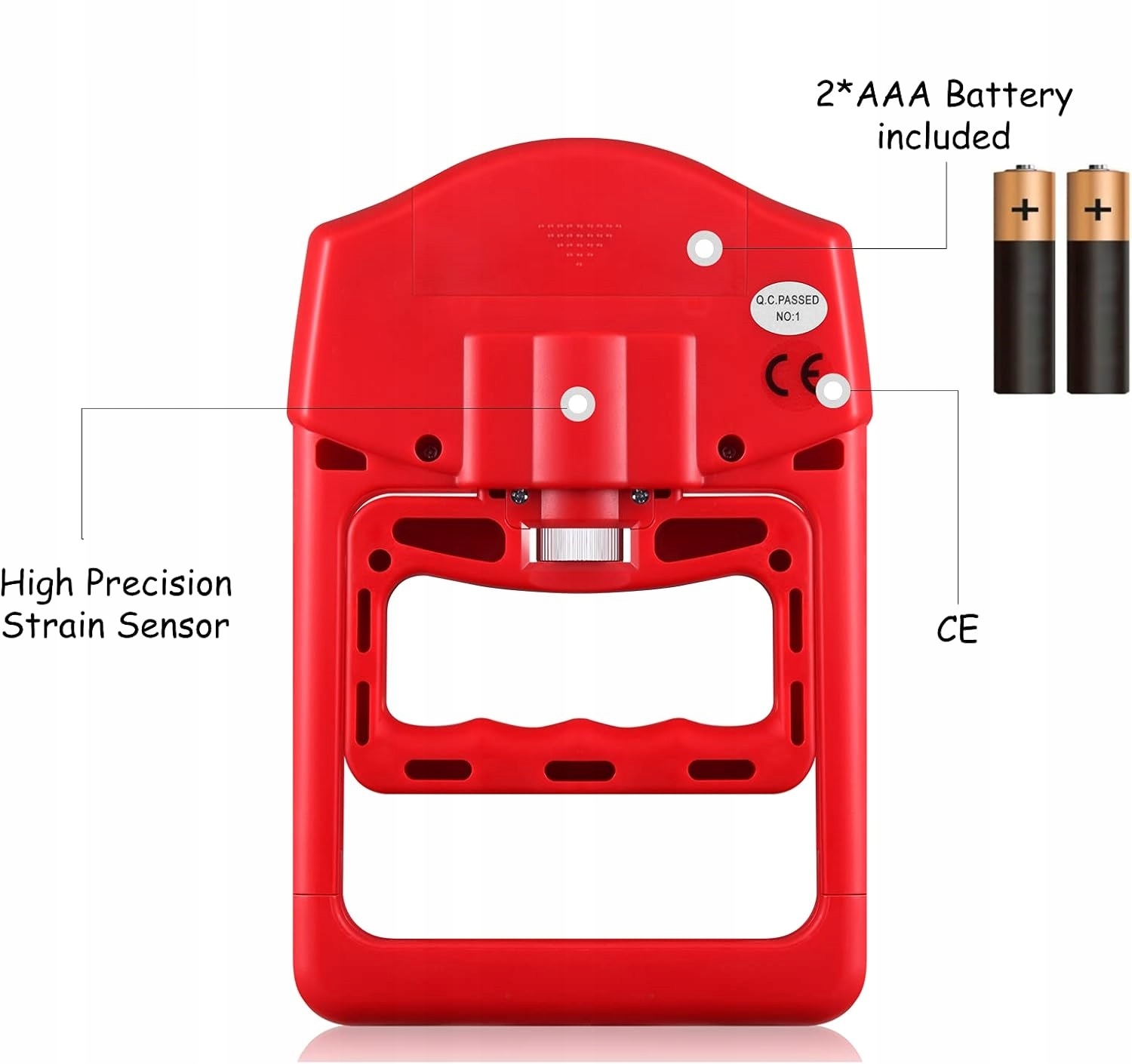 - 2 x aaa батареї розташована норма (слабка, нормальна, сильна). Інструкції включають таблицю зі стандартами для заданого віку та статі (у LBS).