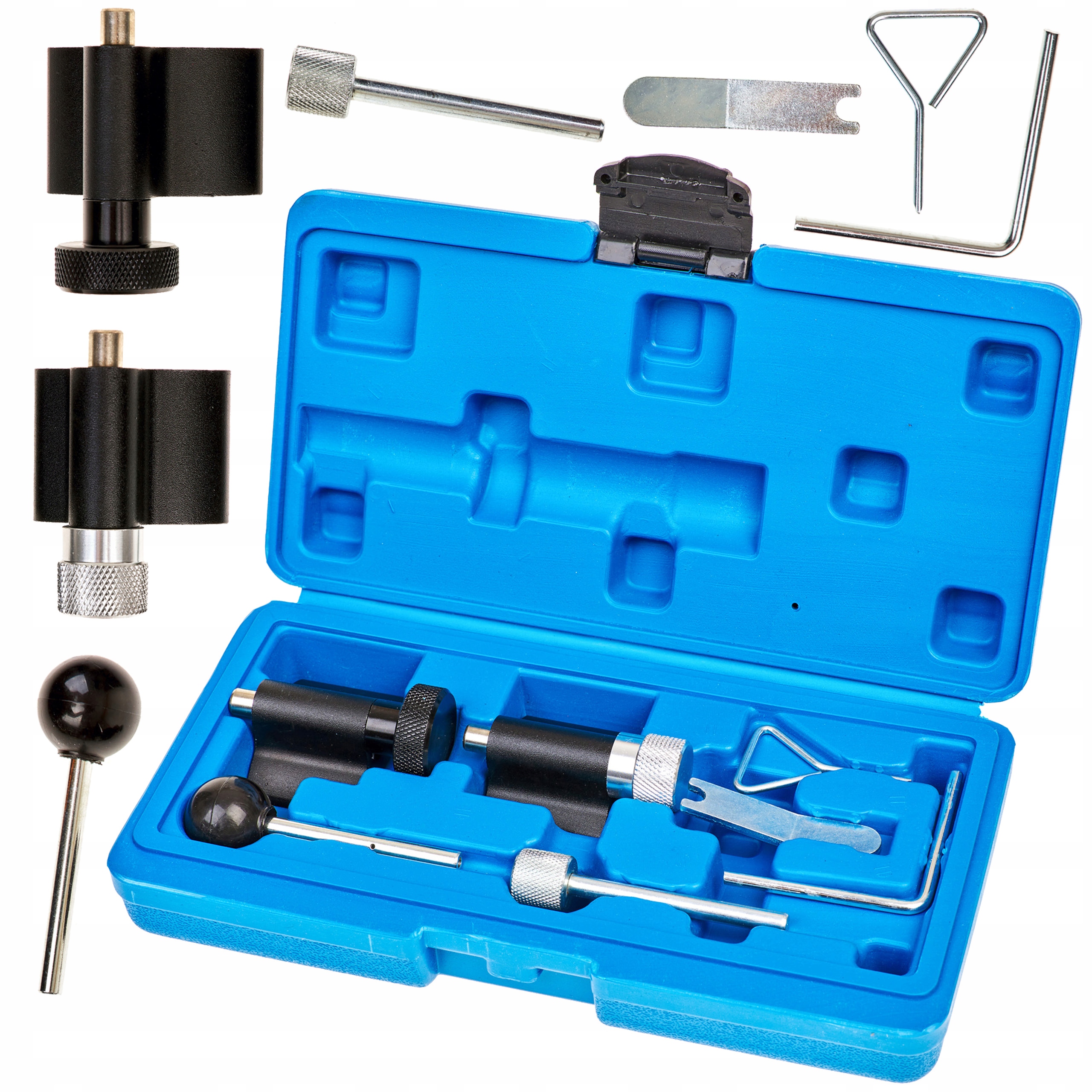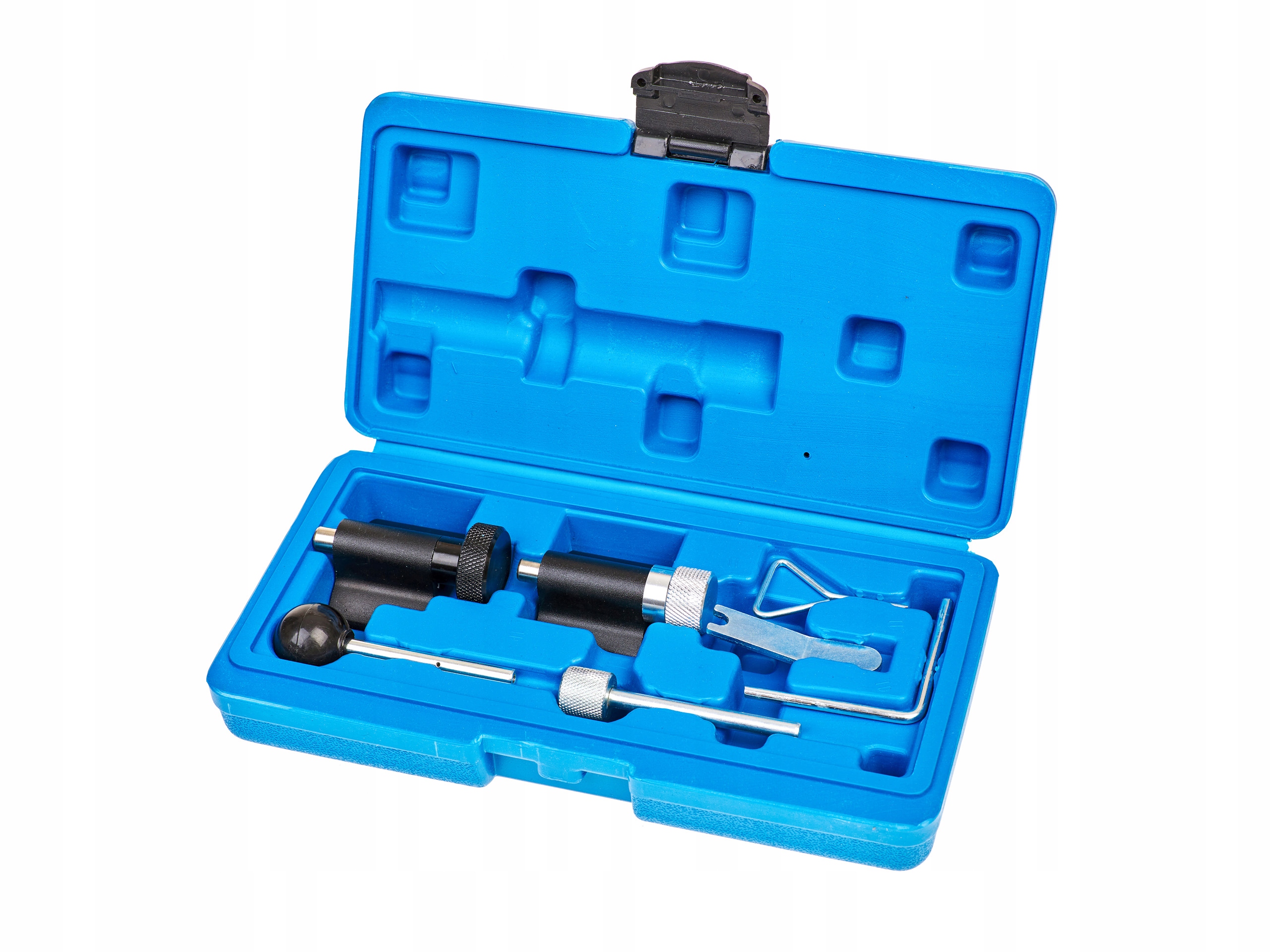 Професійний пристрій для блокування зубчастих шестерень ГРМ. Набір дозволяє зафіксувати зубчасті шестерні ГРМ в сервісному положенні при заміні ременя ГРМ. Особлива форма замків дозволяє точно встановити запалювання контрольні точки Замки фіксують шестерні ГРМ і колінчастого вала, а також шків натяжителя ременя Рекомендовано для професійного використання в спеціалізованих автосервісах Комплект складається з чотирьох замків спеціальної конструкції і форми, замки з вуглецевої сталі, хромовані або оксидований Весь набір упакований у практичну валізу