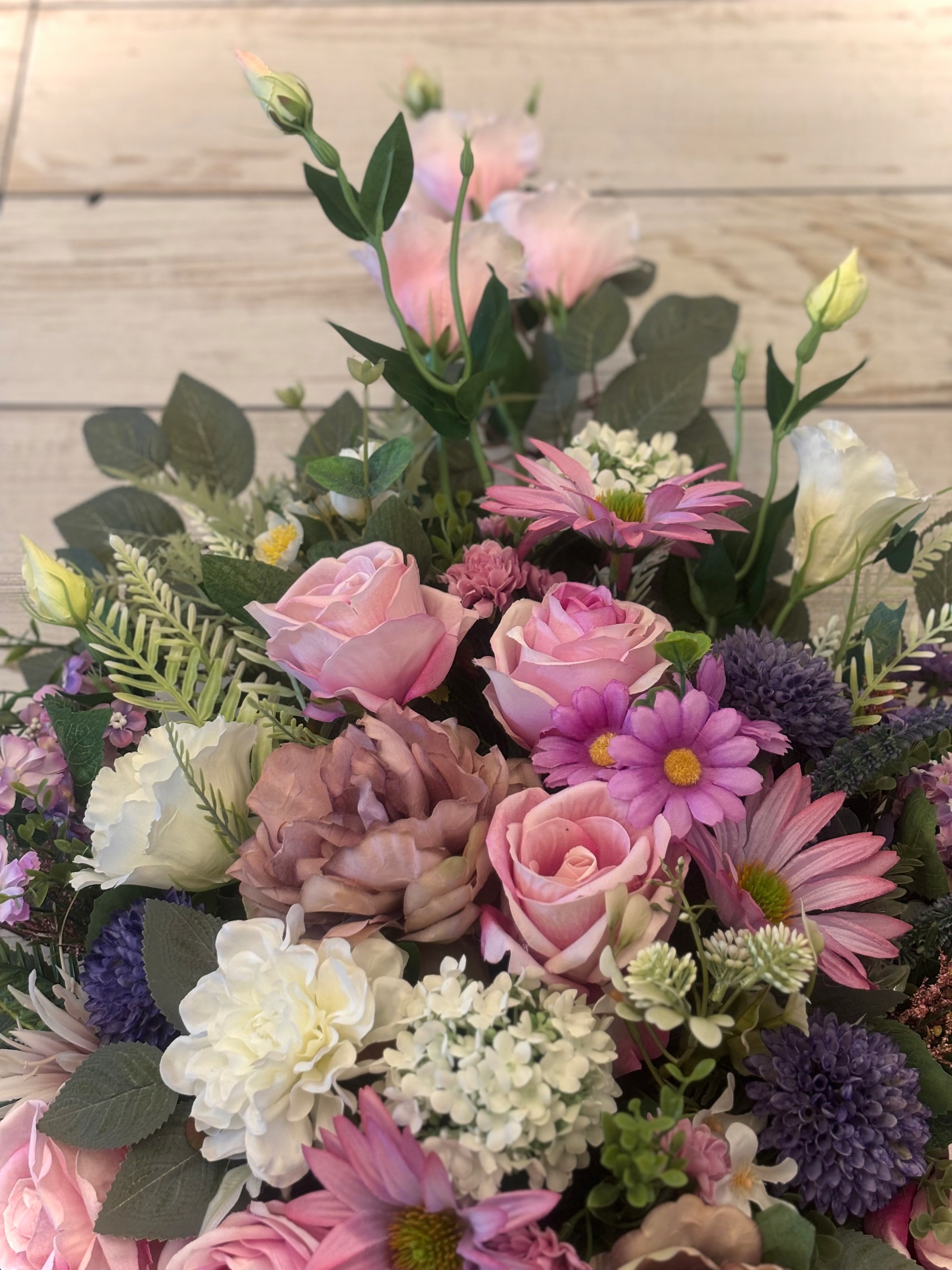 Тема продажу - це прекрасна купа/Рід із штучними квітами, в елегантній, обтяженій круглої миски. /p>