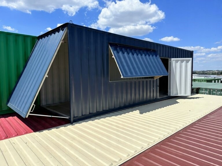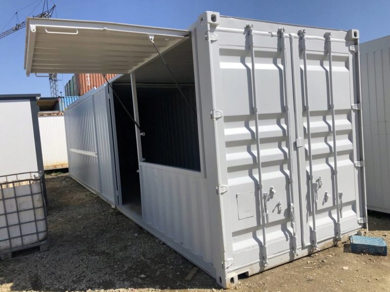 Гастрономічний і комерційний контейнер з площа 15 м2 з пневматичним підйомним бічним клапаном і оригінальними морськими воротами
