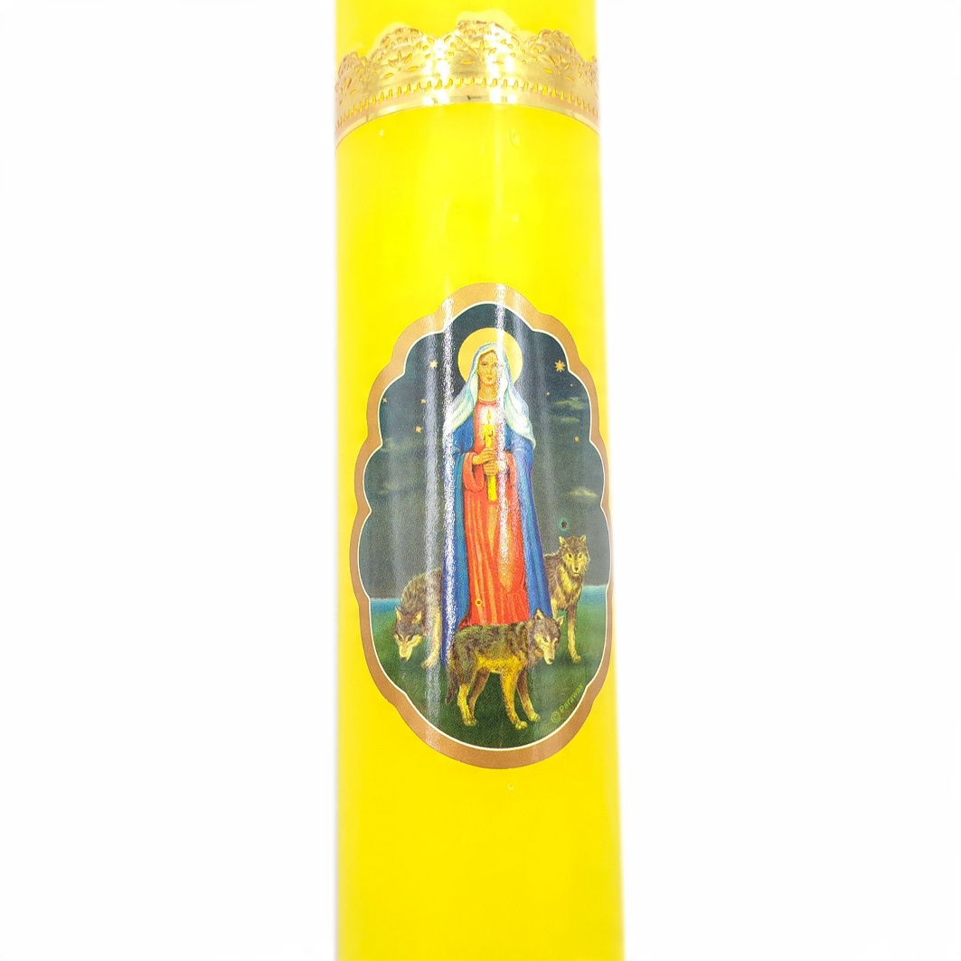Свічка діаметром 4,5 см прикрашена золотими елементами та зображенням Матері Божої Свічки.