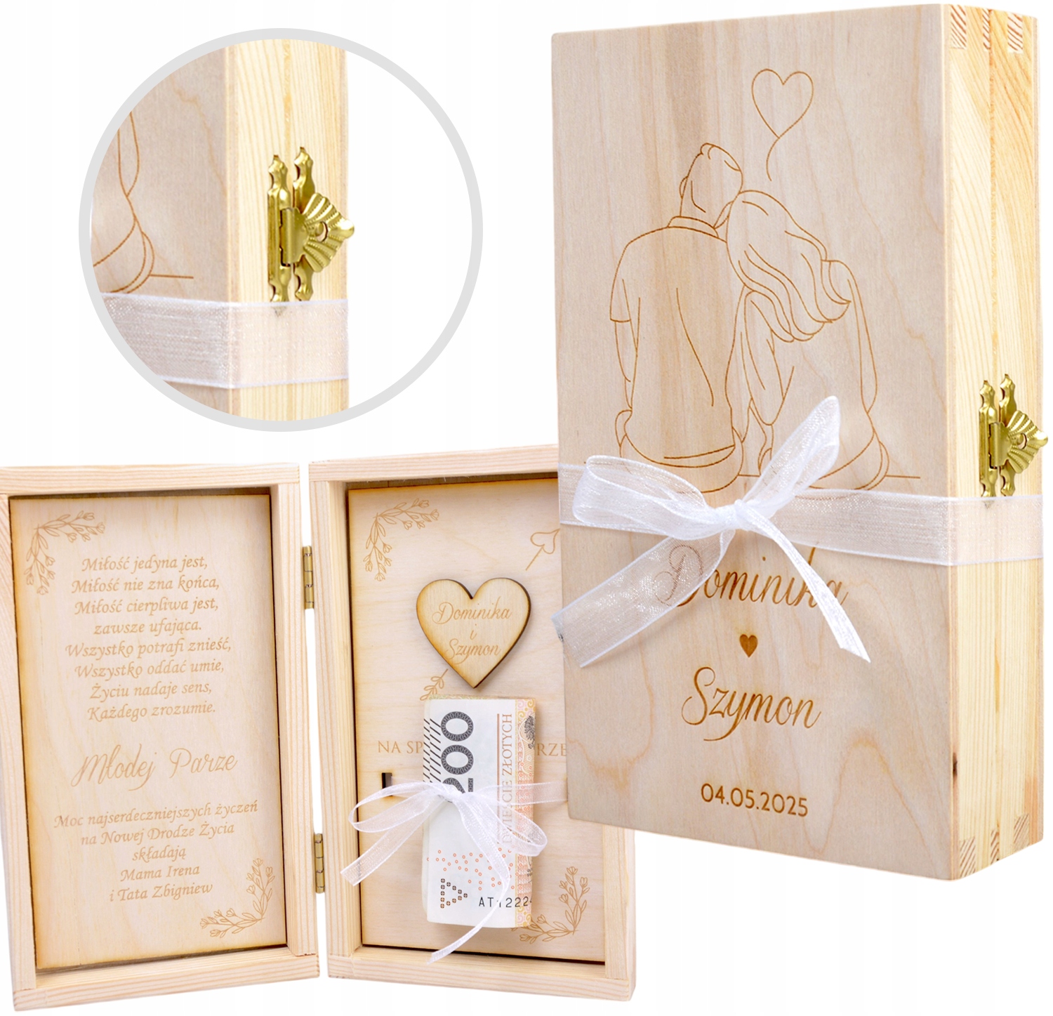 Елегантна коробка з натуральної деревини, з прекрасною, точною гравюром. Всередині ви знайдете ретельно гравіровані побажання, дерев’яне серце з іменами молодят та спеціальним місцем для грошей, пов'язаних з декоративною стрічкою.