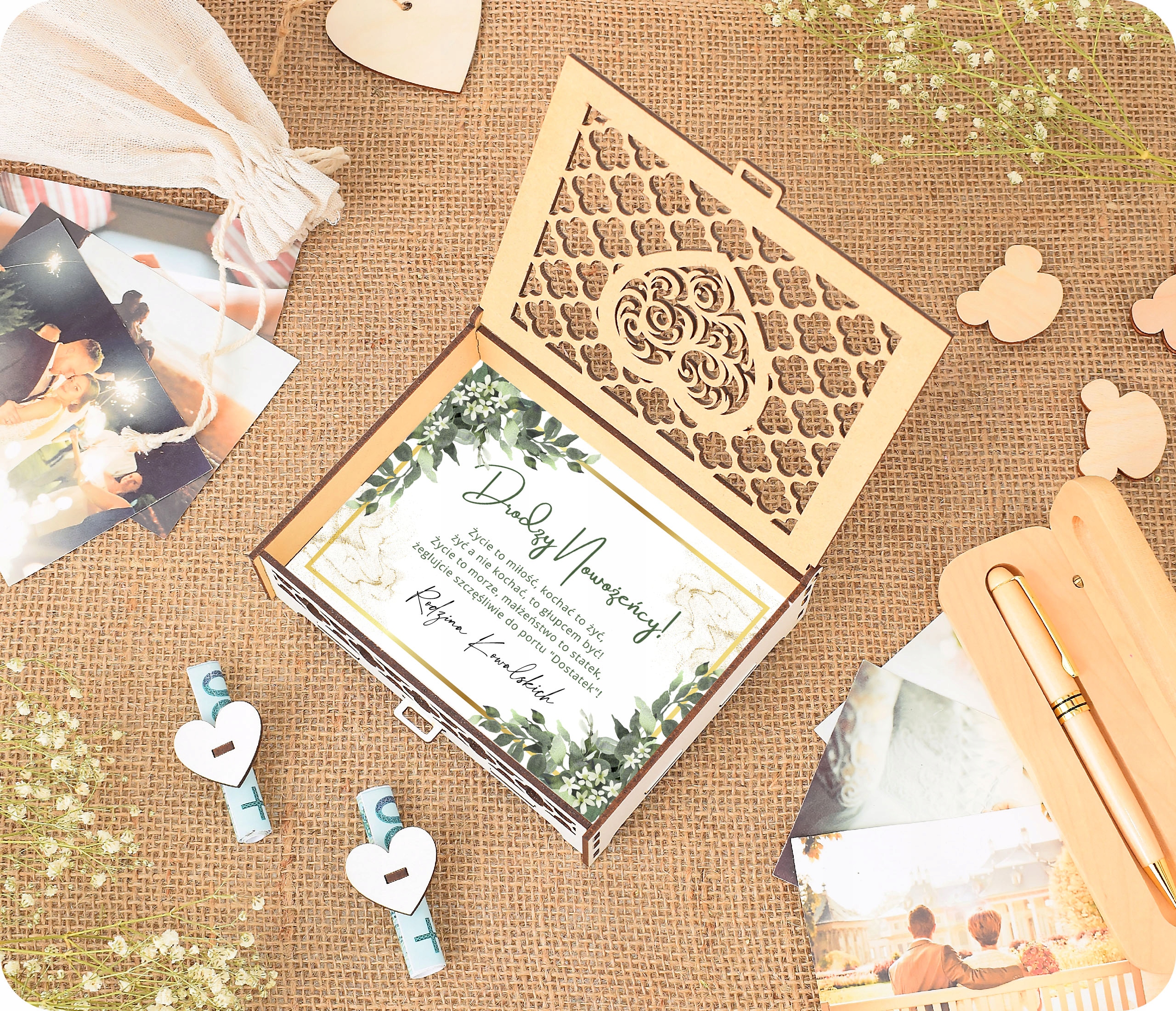 ✔ дерев’яна майстерність , відкрита робота на передній частині коробки - молодята отримують тривалий сувенір, який вчасно не втрачає цінності.