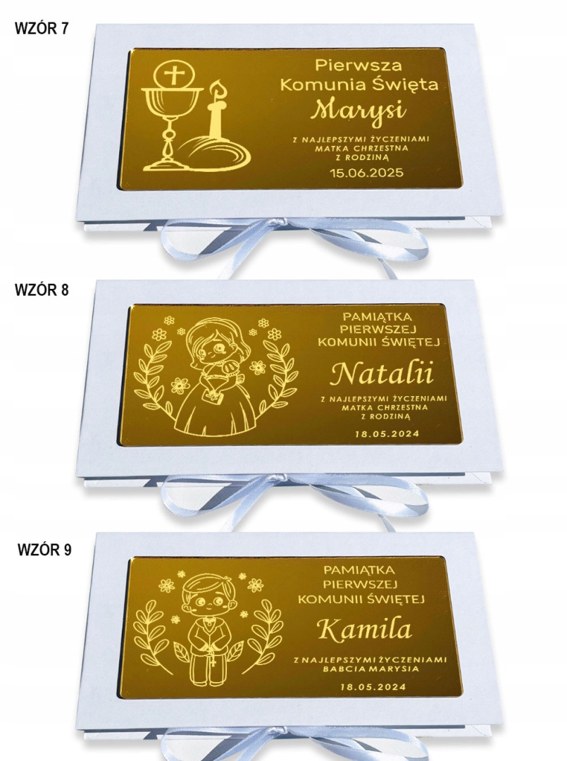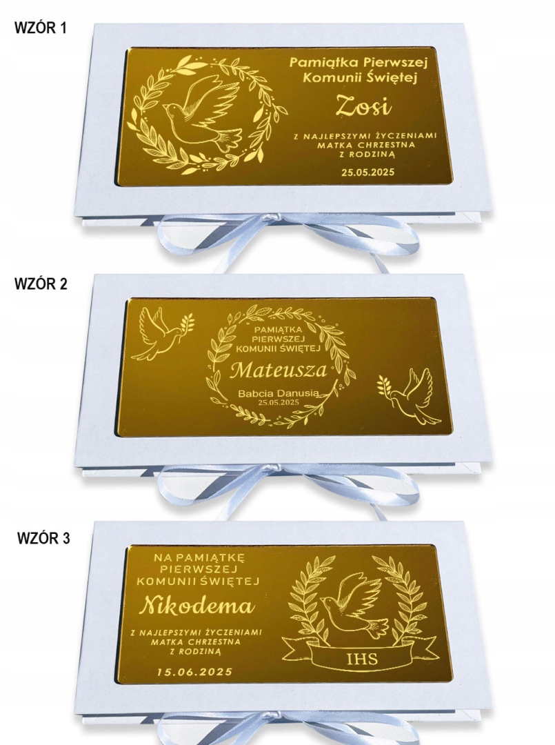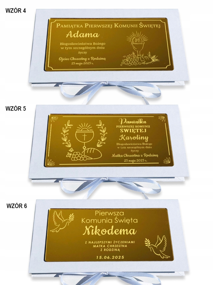 посеред коробки вставлені побажання вставлені на знімки з нагоди першого святого причастя та білої стрічки , під якою можна покласти гроші. Якщо є одна людина, яка передає, то вставлені побажання знаходяться в одній формі.