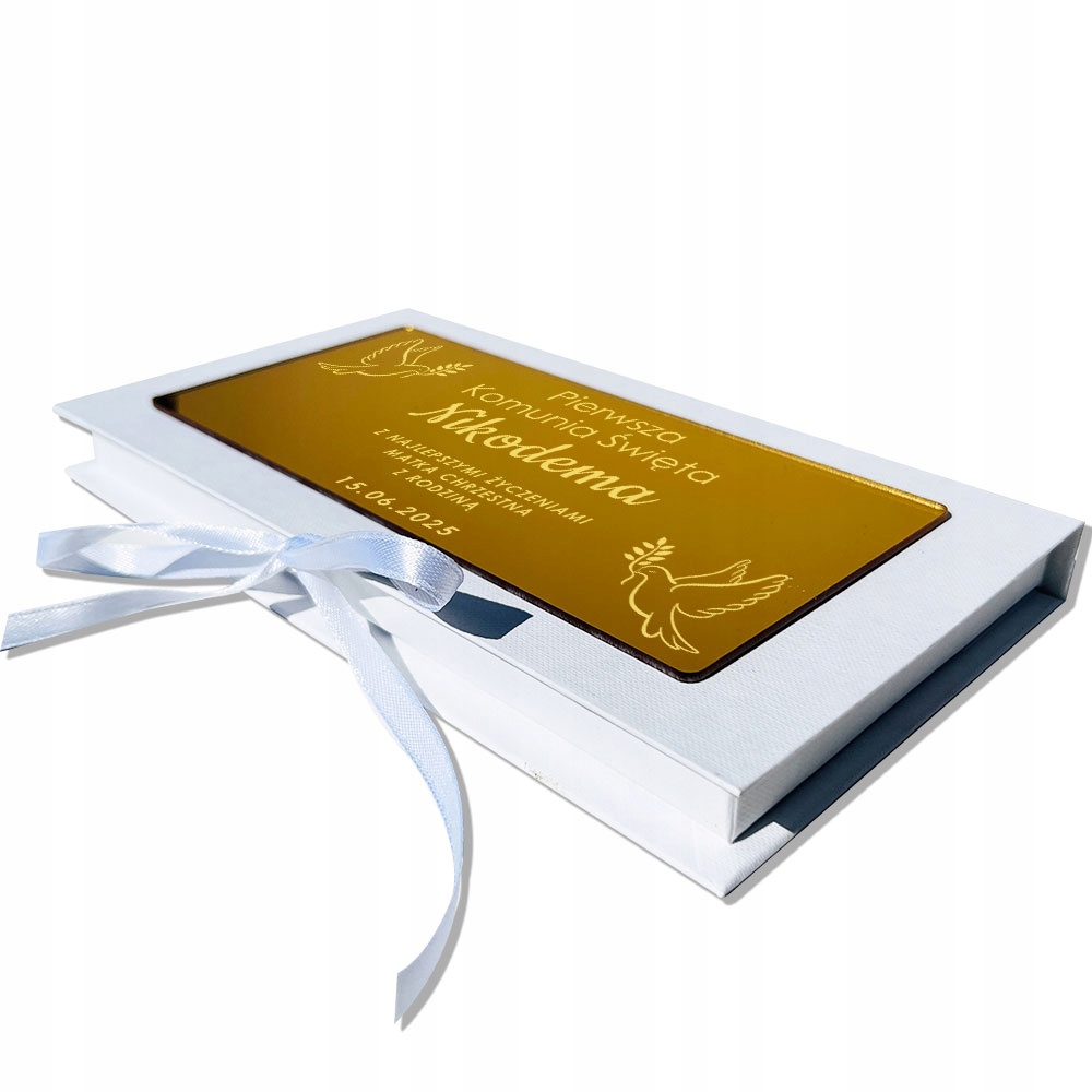 Коробка була вироблена в Польщі з найбільшою обережністю та увагою до кожної деталі. Виготовлений з високоякісного товстого картону, покритого декоративним білим шпоном та золотим акриловим дзеркалом. Білі стрічки прикріплені до коробки, завдяки якому ми можемо декоративний лук . Це порадує всіх своєю зовнішністю та функціональністю, і завдяки персоналізованій гравюрі протягом багатьох років залишатиметься сувенір.