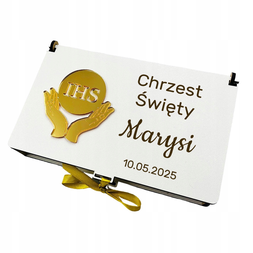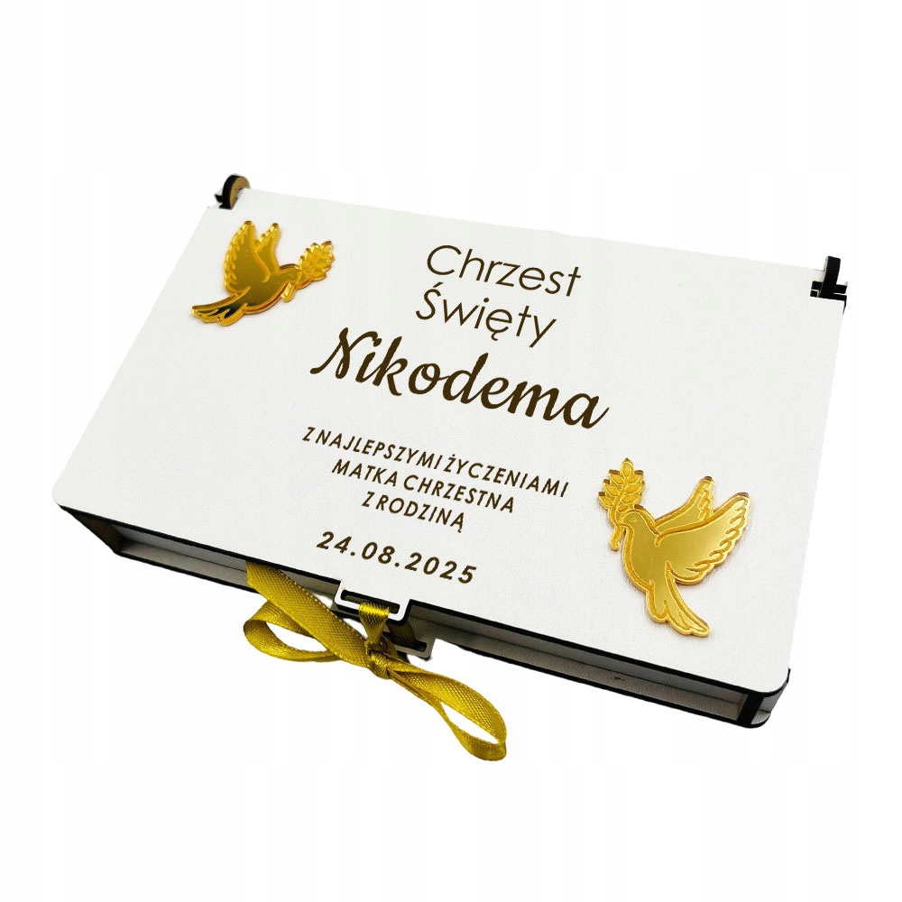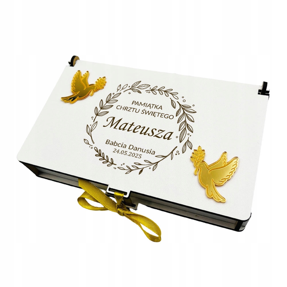 дерев’яна коробка за гроші з травою, обраною вами, яка прикрашена золотим дзеркалом. Доповнення. Коробка була вироблена в Польщі з найбільшою обережністю та увагою до кожної деталі. Виготовлений з високоякісної HDF, що є матеріалом на основі деревини та золотим акриловим дзеркалом. Це порадує всіх своєю зовнішністю та функціональністю, і завдяки персоналізованій гравюрі протягом багатьох років залишиться сувенір.