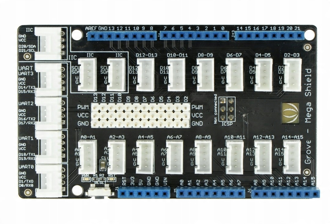 Плече для Arduino Mega розширює можливості контактів введення/виведення. Адаптований до модулів і датчиків серії Grove. Він оснащений 4-контактним роз’ємом Grove, а також усіма контактами, відомими від Arduino. Працює з напругою 3,3 В і 5 В.