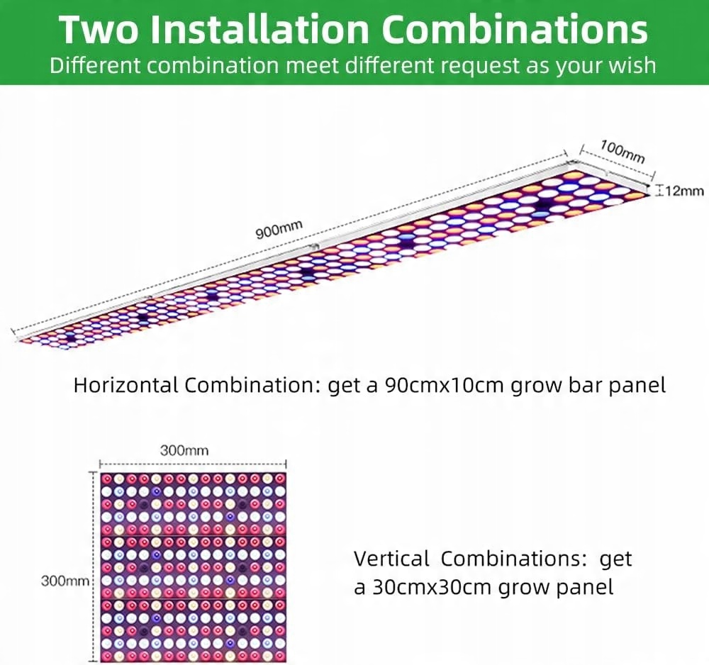 Освітлення повного спектру постачається з трьома панелями, які можна легко з’єднати в квадратну форму (30*30 см) або прямокутну ( 90*10 см). Його можна легко встановити в різних місцях. Ви можете вибрати або змінити тип комбінації за потреби.