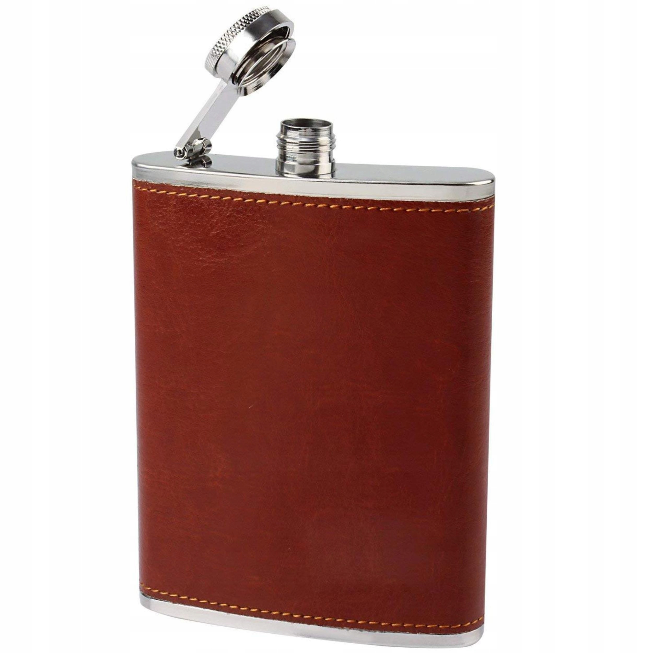 PIERSIÓWKA STAL NIERDZEWNA OBITA STYLOWĄ BRĄZOWĄ SKÓRĄ 240ML 8OZ